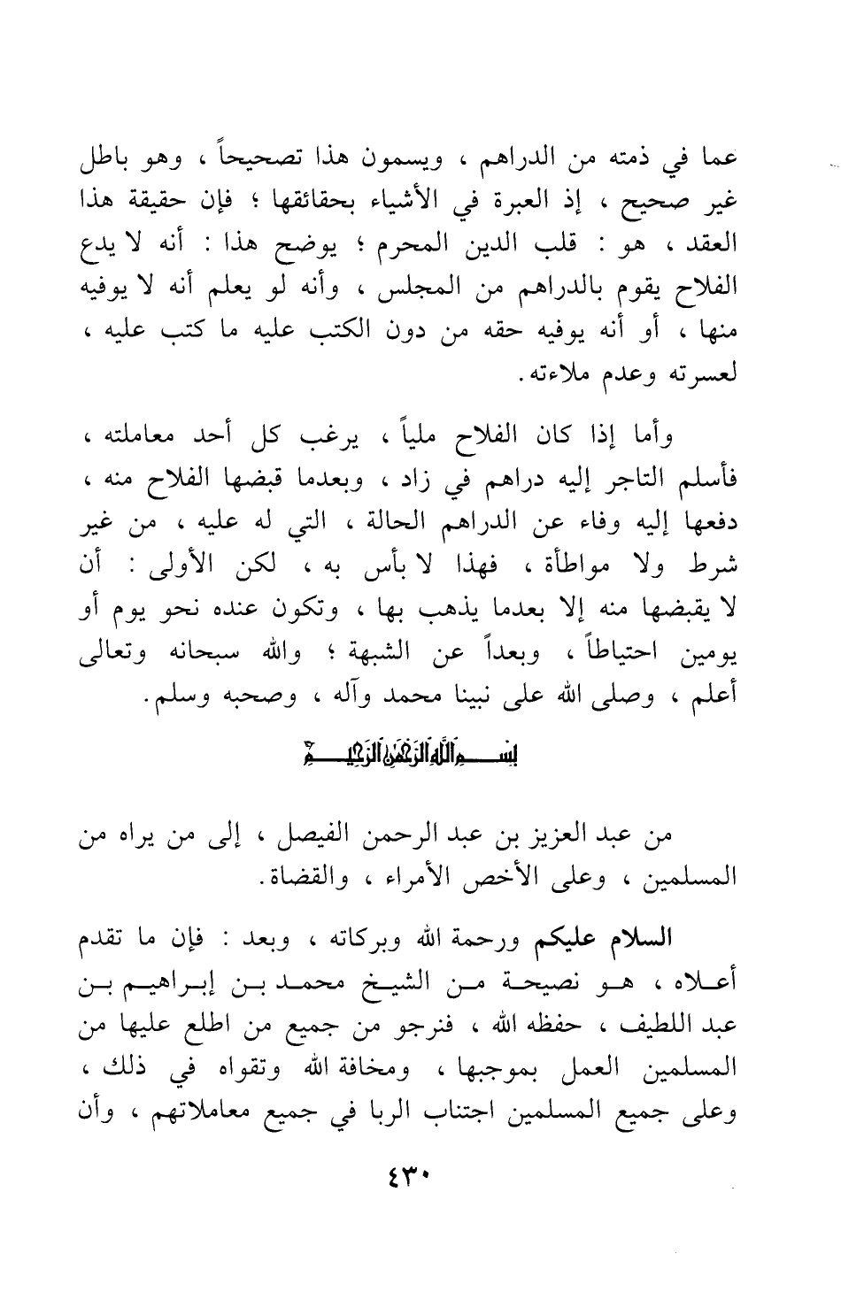 من عبد العزيز بن عبد الرحمن الفيصل، إلى من يراه من المسلمين، وعلى الأخص الأمراء والقضاة.