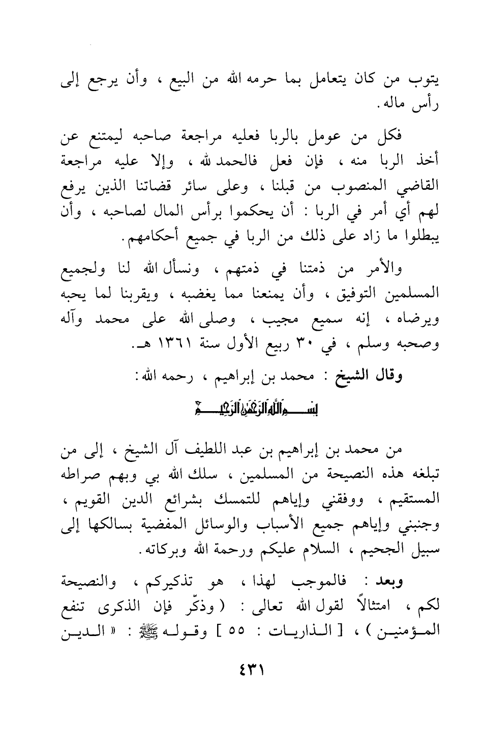فكل من عومل بالربا فعليه مراجعة صاحبه ليمتنع عن أخذ الربا منه، فإن فعل فالحمد لله، وإلا عليه مراجعة القاضي المنصوب من قبلنا. وعلى سائر قضاتنا الذين يرفع لهم أي: أمر في الربا أن يحكموا برأس المال لصاحبه، وأن يبطلوا ما زاد على ذلك من الربا في جميع أحكامهم. والأمر من ذمتنا في ذمتهم، ونسأل الله لنا ولجميع المسلمين التوفيق، وأن يمنعنا مما يغضبه، ويقربنا لما يحبه ويرضاه، إنه سميع مجيب، وصلى الله على محمد وآله وصحبه وسلم، في 30 ربيع الأول سنة 1361 هـ.