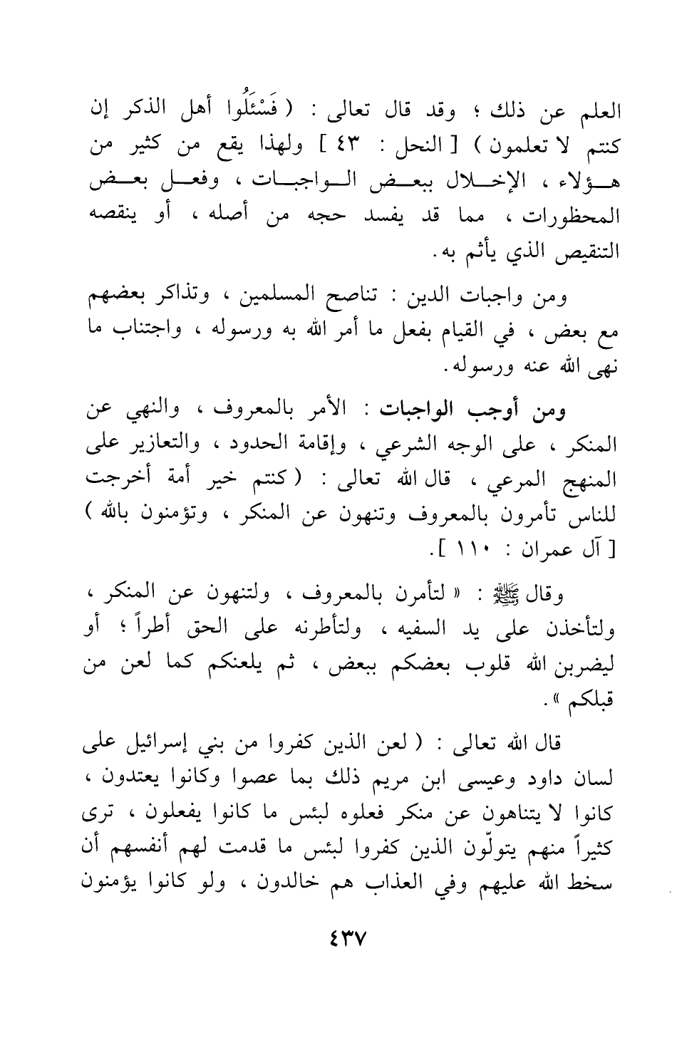 ومن أوجب الواجبات: الأمر بالمعروف، والنهي عن المنكر، على الوجه الشرعي، وإقامة الحدود، والتعازير على المنهج الشرعي، قال الله تعالى: كُنْتُمْ خَيْرَ أُمَّةٍ أُخْرِجَتْ لِلنَّاسِ تَأْمُرُونَ بِالْمَعْرُوفِ وَتَنْهَوْنَ عَنِ الْمُنْكَرِ وَتُؤْمِنُونَ بِاللَّهِ} [سورة آل عمران آية: 110] .