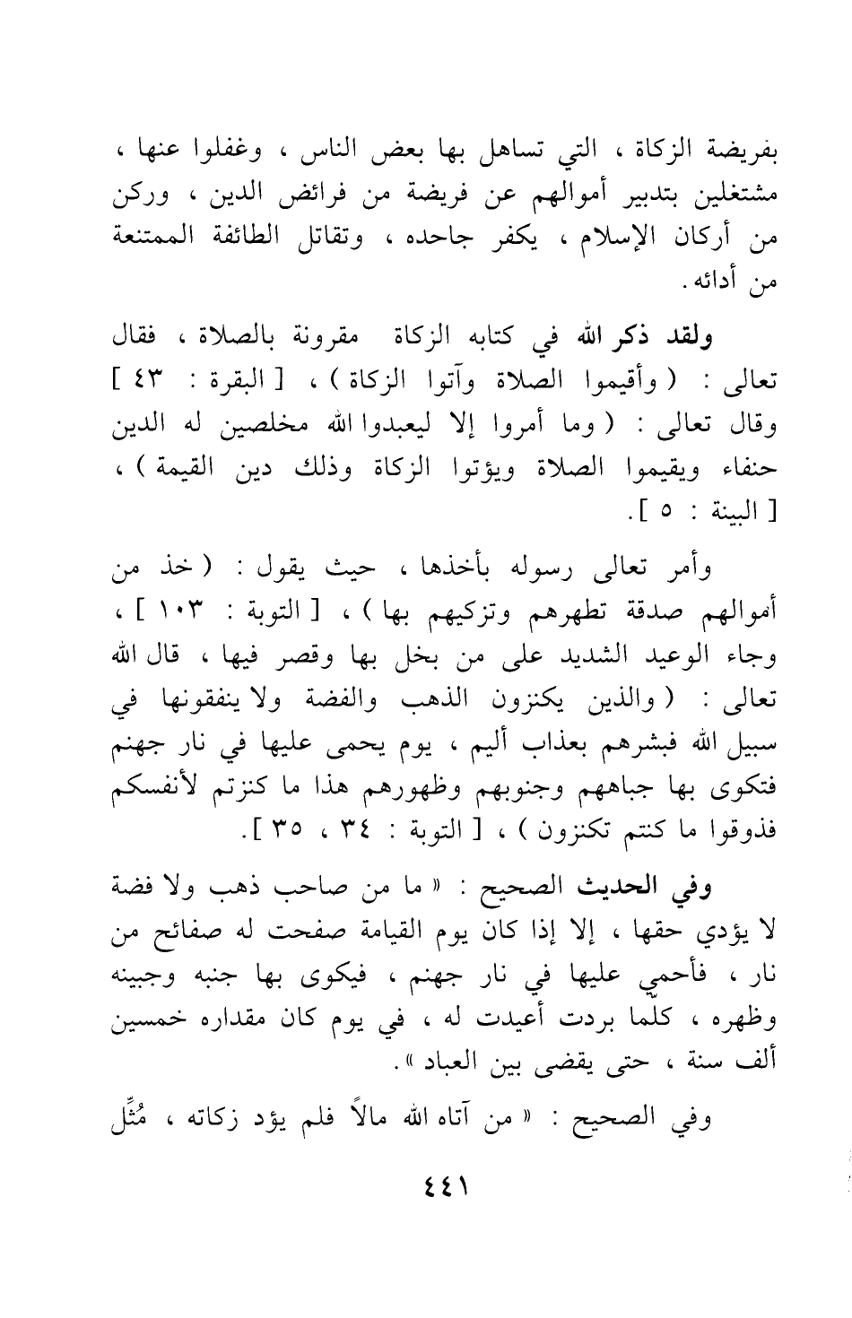 وجاء الوعيد الشديد على من بخل بها وقصر فيها، قال الله تعالى: {وَالَّذِينَ يَكْنِزُونَ الذَّهَبَ وَالْفِضَّةَ وَلا يُنْفِقُونَهَا فِي سَبِيلِ اللَّهِ فَبَشِّرْهُمْ بِعَذَابٍ أَلِيمٍ يَوْمَ يُحْمَى عَلَيْهَا فِي نَارِ جَهَنَّمَ فَتُكْوَى بِهَا جِبَاهُهُمْ وَجُنُوبُهُمْ وَظُهُورُهُمْ هَذَا مَا كَنَزْتُمْ لانْفُسِكُمْ فَذُوقُوا مَا كُنْتُمْ تَكْنِزُونَ} [سورة التوبة آية: 34-35] .