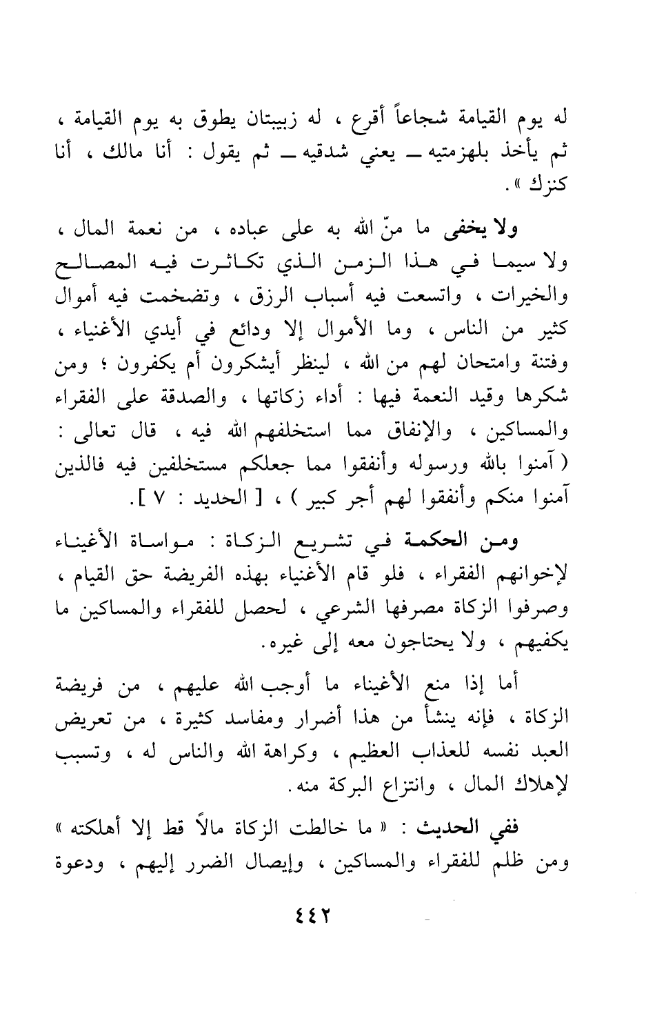 ولا يخفى ما منّ الله به على عباده، من نعمة المال، ولا سيما في هذا الزمن الذي تكاثرت فيه المصالح والخيرات، واتسعت فيه أسباب الرزق، وتضخمت فيه أموال كثير من الناس؛ وما الأموال إلا ودائع في أيدي الأغنياء، وفتنة وامتحان لهم من الله، لينظر أيشكرون أم يكفرون. ومن شكرها وقيد النعمة فيها: أداء زكاتها، والصدقة على الفقراء والمساكين، والإنفاق مما استخلفهم الله فيه، قال تعالى: {آمِنُوا بِاللَّهِ وَرَسُولِهِ وَأَنْفِقُوا مِمَّا جَعَلَكُمْ مُسْتَخْلَفِينَ فِيهِ فَالَّذِينَ آمَنُوا مِنْكُمْ وَأَنْفَقُوا لَهُمْ أَجْرٌ كَبِيرٌ} [سورة الحديد آية: 7] .