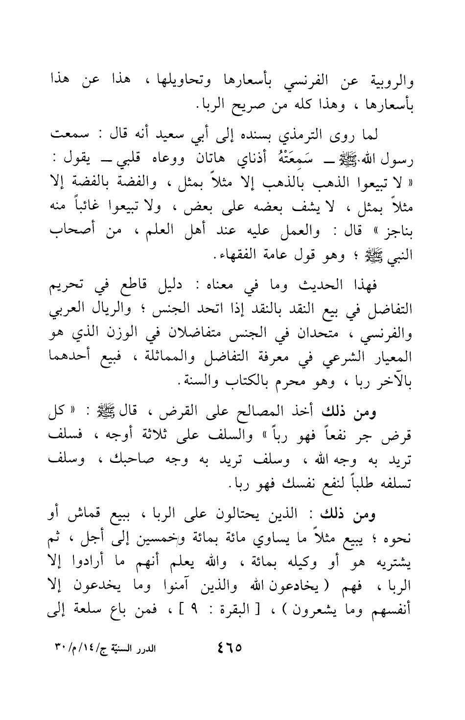 فهذا الحديث وما في معناه: دليل قاطع في تحريم التفاضل في بيع النقد بالنقد إذا اتحد الجنس، والريال العربي والفرنسي، متحدان في الجنس متفاضلان في الوزن الذي هو المعيار الشرعي في معرفة التفاضل والمماثلة، فبيع أحدهما بالآخر ربا، وهو محرم بالكتاب والسنة.