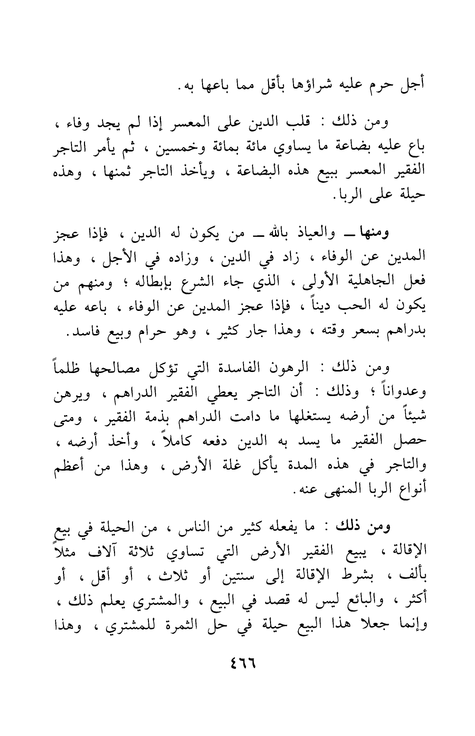 ومنها - والعياذ بالله -: من يكون له الدين، فإذا عجز المدين عن الوفاء، زاد في الدين، وزاده في الأجل، وهذا فعل الجاهلية الأولى، الذي جاء الشرع بإبطاله. ومنهم: مَن يكون له الحب دينا، فإذا عجز المدين عن الوفاء، باعه عليه بدراهم بسعر وقته، وهذا جار كثير، وهو حرام وبيع فاسد.
