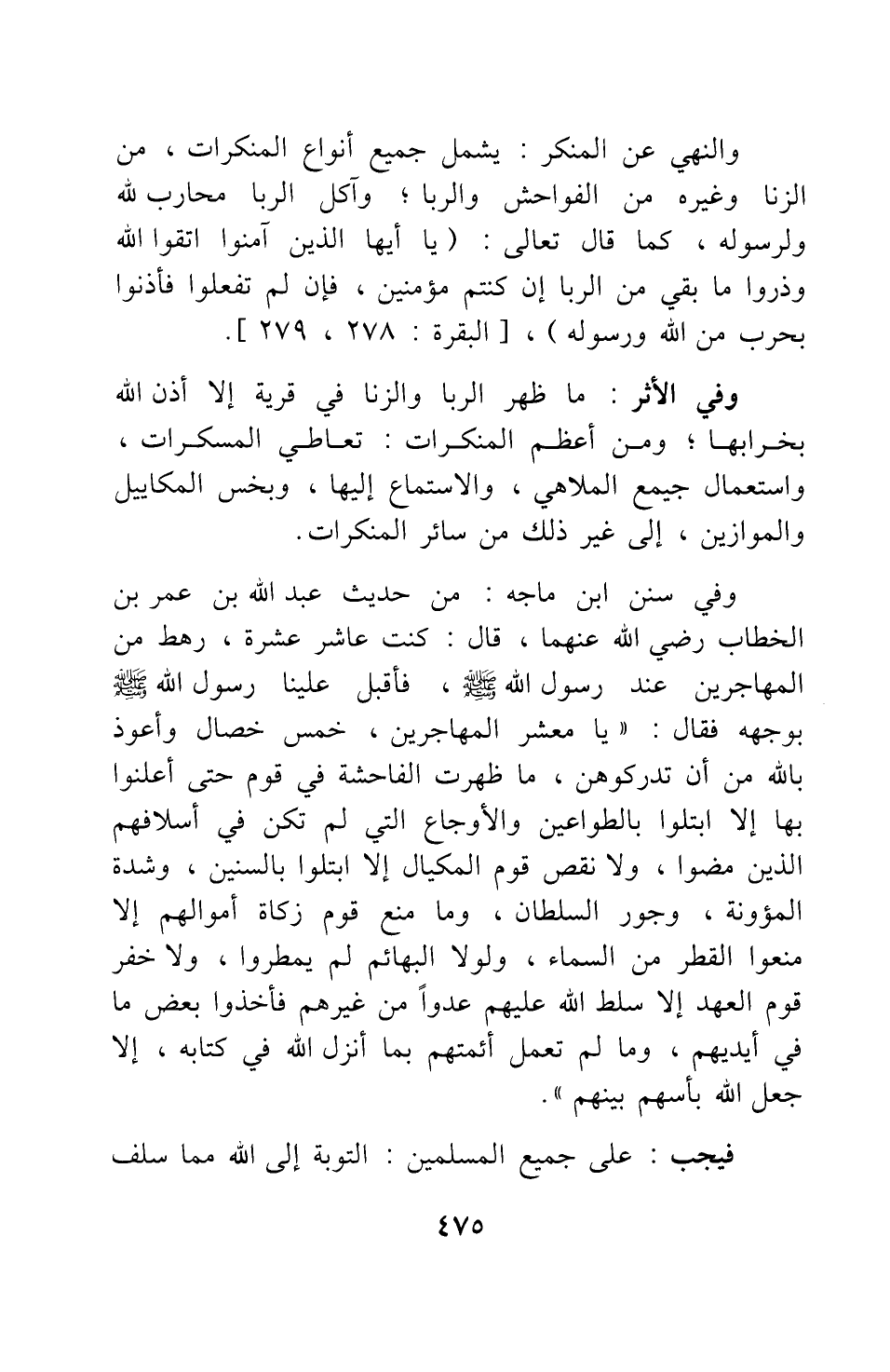وفي الأثر: ما ظهر الربا والزنا في قرية إلا أذن الله بخرابها; ومن أعظم المنكرات: تعاطي المسكرات، واستعمال جميع الملاهي، والاستماع إليها، وبخس المكاييل والموازين، إلى غير ذلك من سائر المنكرات.