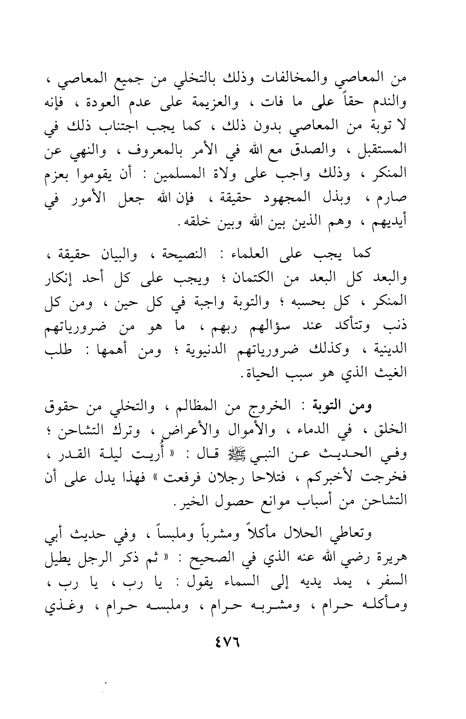 من المعاصي والمخالفات وذلك بالتخلي من جميع المعاصي، والندم حقا على ما فات، والعزيمة على عدم العودة، فإنه لا توبة من المعاصي بدون ذلك. كما يجب اجتناب ذلك في المستقبل، والصدق مع الله في الأمر بالمعروف، والنهي عن المنكر وذلك واجب على ولاة المسلمين أن يقوموا بعزم صارم، وبذل المجهود حقيقة، فإن الله جعل الأمور في أيديهم، وهم الذين بين الله وبين خلقه.