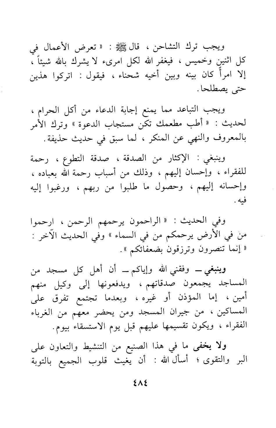 ويجب ترك التشاحن، قال صلى الله عليه وسلم: تعرض الأعمال في كل اثنين وخميس، فيغفر الله لكل امرئ لا يشرك بالله شيئا، إلا امرأ كان بينه وبين أخيه شحناء، فيقول: اتركوا هذين حتى يصطلحا 1.