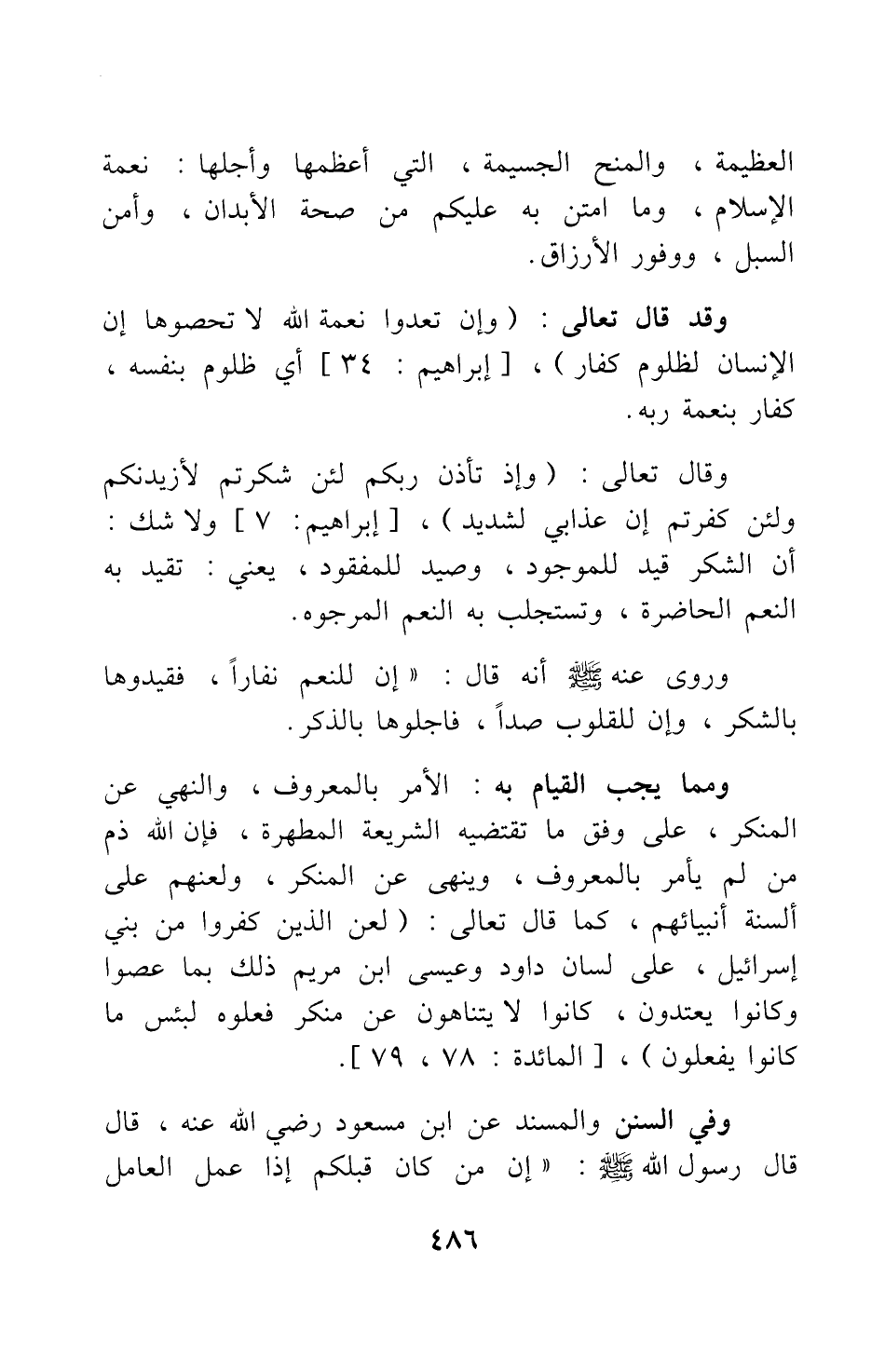 ومما يجب القيام به: الأمر بالمعروف، والنهي عن المنكر، على وفق ما تقتضيه الشريعة المطهرة، فإن الله ذم من لم يأمر بالمعروف، وينهى عن المنكر، ولعنهم على ألسنة أنبيائهم، كما قال تعالى: {لُعِنَ الَّذِينَ كَفَرُوا مِنْ بَنِي إِسْرائيلَ عَلَى لِسَانِ دَاوُدَ وَعِيسَى ابْنِ مَرْيَمَ ذَلِكَ بِمَا عَصَوْا وَكَانُوا يَعْتَدُونَ كَانُوا لا يَتَنَاهَوْنَ عَنْ مُنْكَرٍ فَعَلُوهُ لَبِئْسَ مَا كَانُوا يَفْعَلُونَ} [سورة المائدة آية: 78-79] .