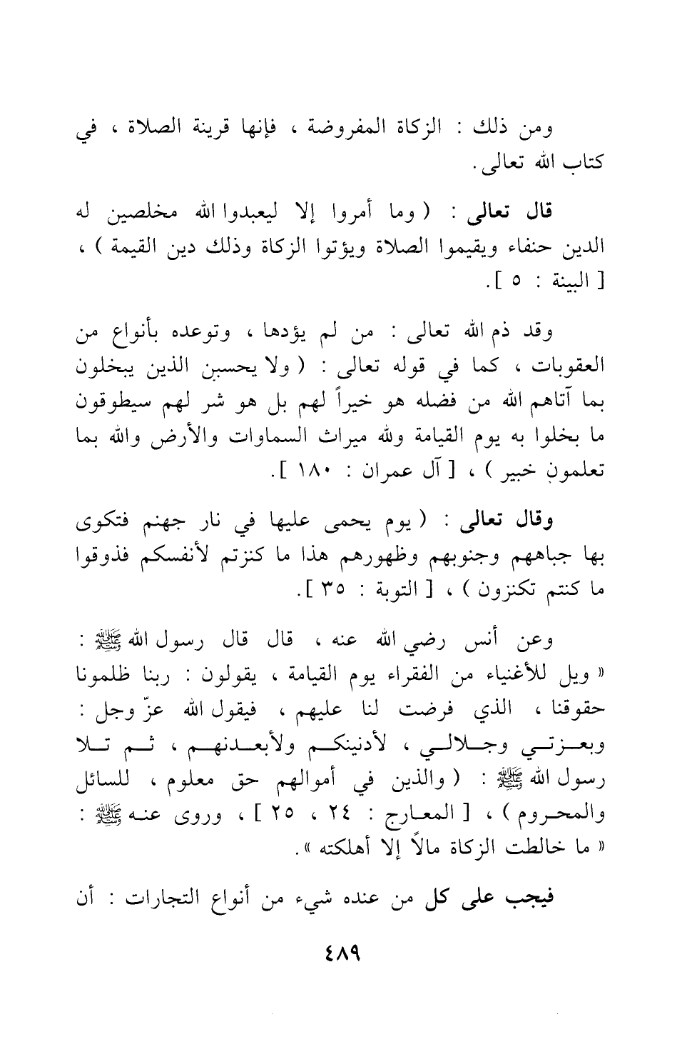 ومن ذلك: الزكاة المفروضة، فإنها قرينة الصلاة، في كتاب الله تعالى. قال تعالى: {وَمَا أُمِرُوا إِلاّ لِيَعْبُدُوا اللَّهَ مُخْلِصِينَ لَهُ الدِّينَ حُنَفَاءَ وَيُقِيمُوا الصَّلاةَ وَيُؤْتُوا الزَّكَاةَ وَذَلِكَ دِينُ الْقَيِّمَةِ} [سورة البينة آية: 5] .