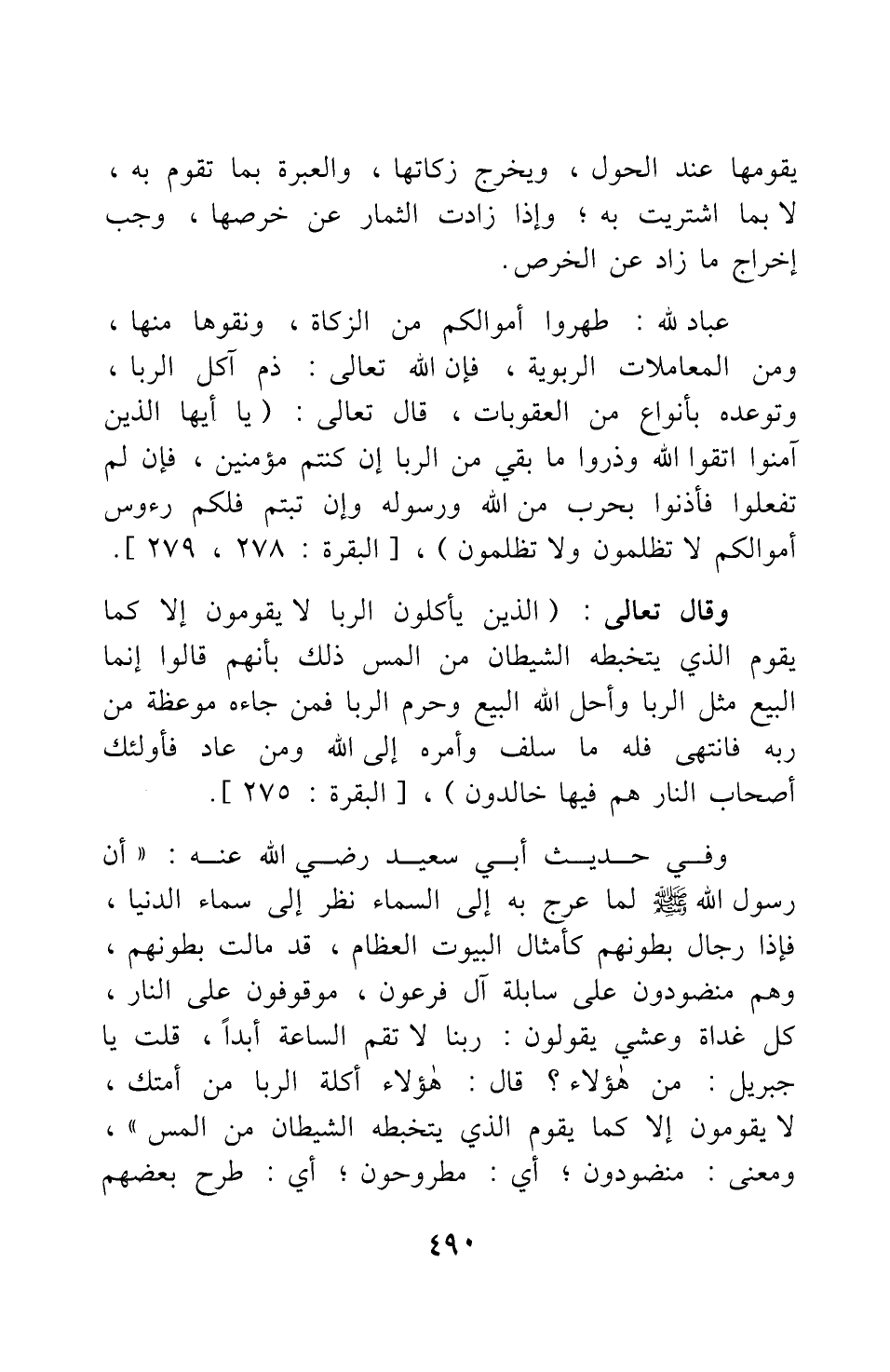 وقال تعالى: {الَّذِينَ يَأْكُلُونَ الرِّبا لا يَقُومُونَ إِلاّ كَمَا يَقُومُ الَّذِي يَتَخَبَّطُهُ الشَّيْطَانُ مِنَ الْمَسِّ ذَلِكَ بِأَنَّهُمْ قَالُوا إِنَّمَا الْبَيْعُ مِثْلُ الرِّبا وَأَحَلَّ اللَّهُ الْبَيْعَ وَحَرَّمَ الرِّبا فَمَنْ جَاءَهُ مَوْعِظَةٌ مِنْ رَبِّهِ فَانْتَهَى فَلَهُ مَا سَلَفَ وَأَمْرُهُ إِلَى اللَّهِ وَمَنْ عَادَ فَأُولَئِكَ أَصْحَابُ النَّارِ هُمْ فِيهَا خَالِدُونَ} [سورة البقرة آية: 275] .
