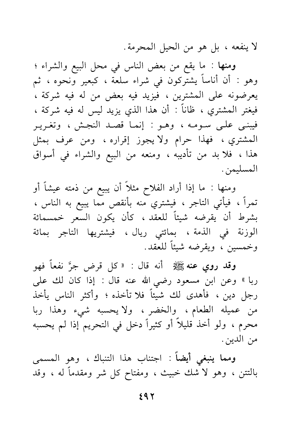 ومنها: ما إذا أراد الفلاح مثلا أن يبيع من ذمته عيشا أو تمرا، فيأتي التاجر، فيشتري منه بأنقص مما يبيع به الناس، بشرط أن يقرضه شيئا للعقد، كأن يكون السعر خمسمائة الوزنة في الذمة، بمائتي ريال، فيشتريها التاجر بمائة وخمسين، ويقرضه شيئا للعقد.