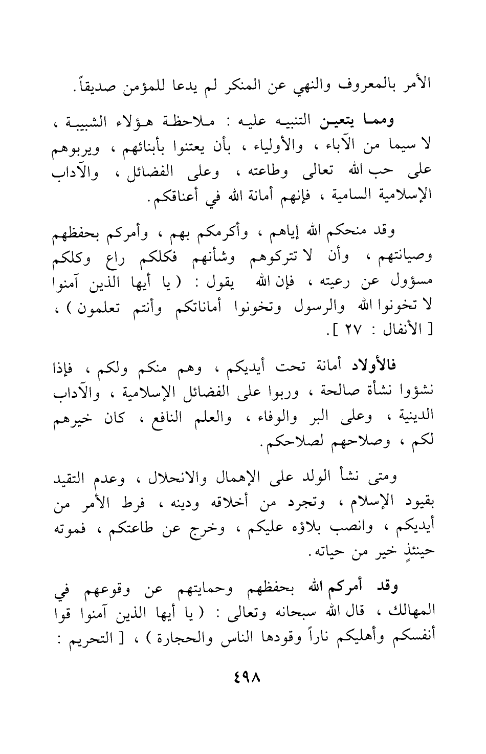 وقد أمركم الله بحفظهم وحمايتهم عن وقوعهم في المهالك، قال الله سبحانه وتعالى: {يَا أَيُّهَا الَّذِينَ آمَنُوا قُوا أَنْفُسَكُمْ وَأَهْلِيكُمْ نَاراً وَقُودُهَا النَّاسُ وَالْحِجَارَةُ} [سورة التحريم آية: