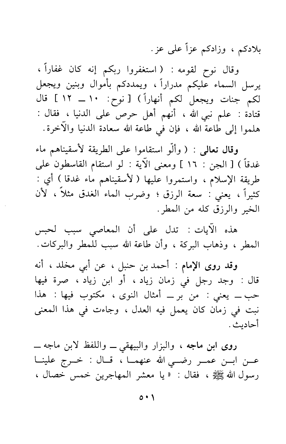 وقال تعالى: {وَأَلَّوِ اسْتَقَامُوا عَلَى الطَّرِيقَةِ لَأَسْقَيْنَاهُمْ مَاءً غَدَقاً} [سورة الجن آية: 16] ، ومعنى الآية: لو استقام القاسطون على طريقة الإسلام، واستمروا عليها: {مَاءً غَدَقاً} [سورة الجن آية: 16] ، أي: كثيرا، يعني: سعة الرزق، وضرب الماء الغدق مثلا، لأن الخير والرزق كله من المطر.