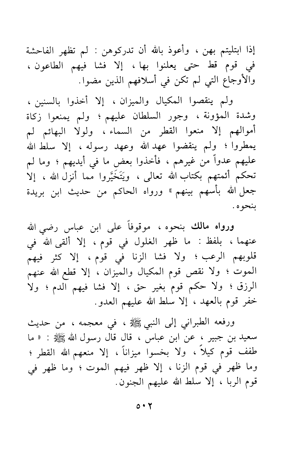 ورفعه الطبراني إلى النبي صلى الله عليه وسلم في معجمه، من حديث سعيد بن جبير، عن ابن عباس، قال: قال رسول الله صلى الله عليه وسلم: ما طفف قوم كيلا، ولا بخسوا ميزانا، إلا منعهم الله القطر. وما ظهر في قوم الزنى، إلا ظهر فيهم الموت. وما ظهر في قوم الربا، إلا سلط الله عليهم الجنون.