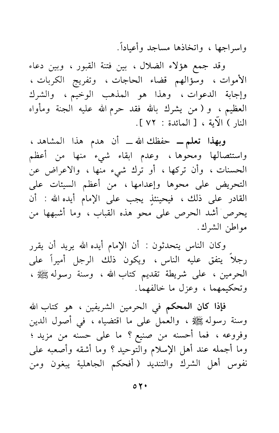 فإذا كان المحكم في الحرمين الشريفين، هو كتاب الله وسنة رسوله صلى الله عليه وسلم والعمل على ما اقتضياه، في أصول الدين وفروعه، فما أحسنه من صنيع! ما على حسنه من مزيد; وما أجمله عند أهل الإسلام والتوحيد! وما أشقه وأصعبه على نفوس أهل الشرك والتنديد! : {أَفَحُكْمَ الْجَاهِلِيَّةِ يَبْغُونَ وَمَنْ