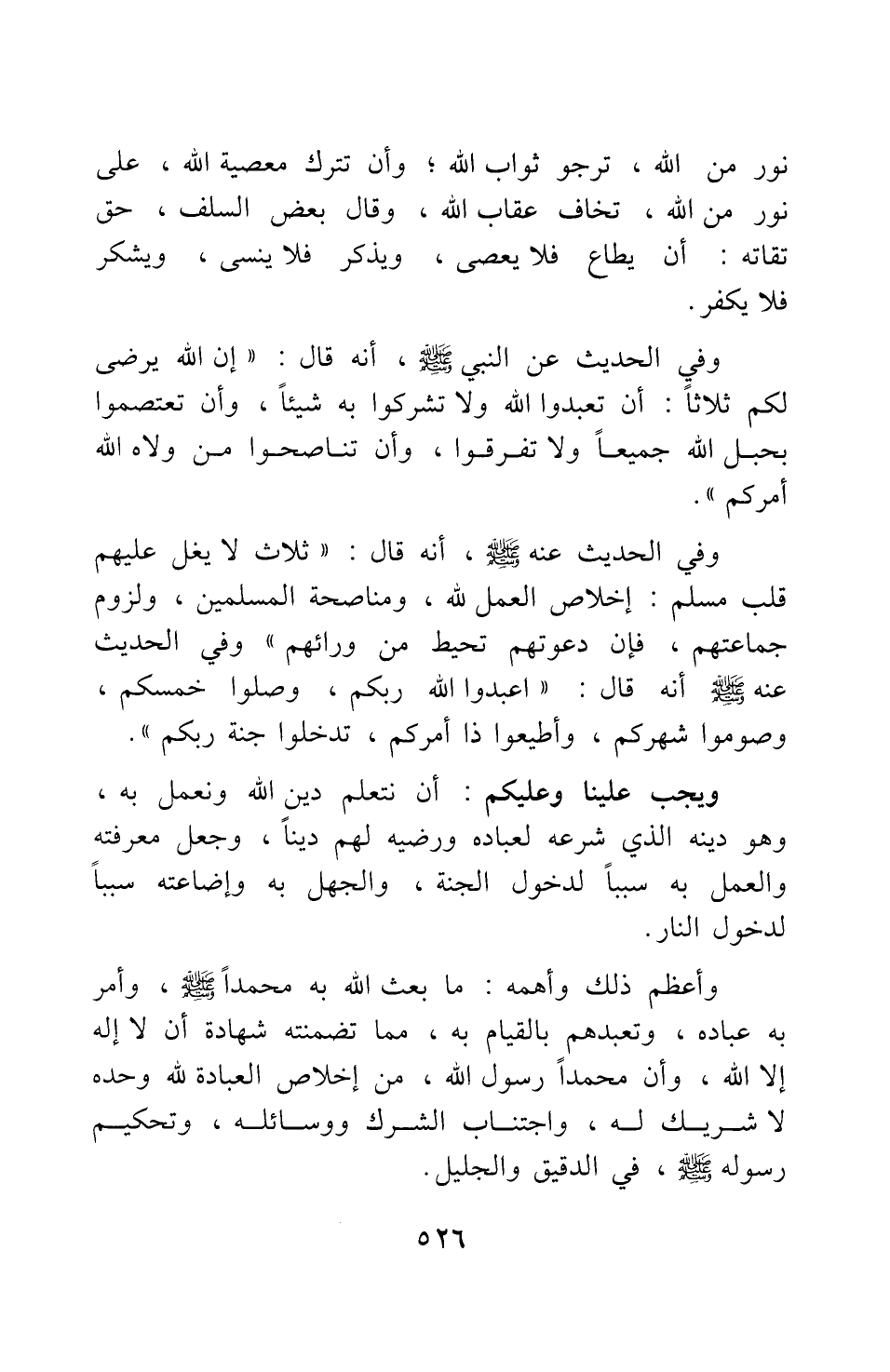وفي الحديث عنه صلى الله عليه وسلم أنه قال: ثلاث لا يغل عليهم قلب مسلم: إخلاص العمل لله، ومناصحة المسلمين، ولزوم جماعتهم، فإن دعوتهم تحيط من ورائهم 2، وفي الحديث عنه صلى الله عليه وسلم أنه قال: اعبدوا الله ربكم، وصلوا خمسكم، وصوموا شهركم، وأطيعوا ذا أمركم، تدخلوا جنة ربكم 3.