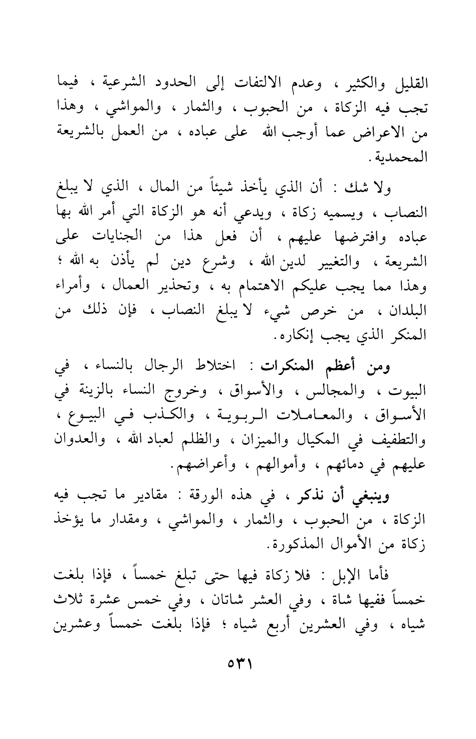ولا شك أن الذي يأخذ شيئا من المال الذي لا يبلغ النصاب، ويسميه زكاة، ويدعي أنه هو الزكاة التي أمر الله بها عباده وافترضها عليهم، أن فعل هذا من الجنايات على الشريعة، والتغيير لدين الله، وشرع دين لم يأذن به الله; وهذا مما يجب عليكم الاهتمام به، وتحذير العمال، وأمراء البلدان، من خرص شيء لا يبلغ النصاب فإن ذلك من المنكر الذي يجب إنكاره.