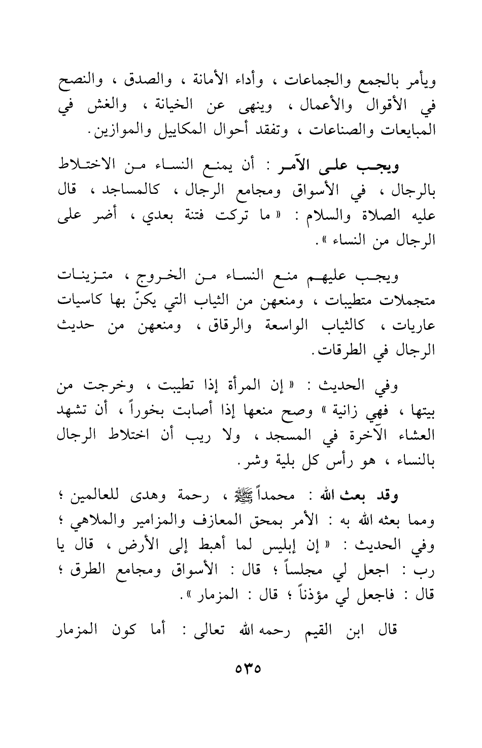 ويجب على الآمر أن يمنع النساء من الاختلاط بالرجال، في الأسواق ومجامع الرجال، كالمساجد، قال عليه الصلاة والسلام: ما تركت فتنة بعدي أضر على الرجال من النساء 1.