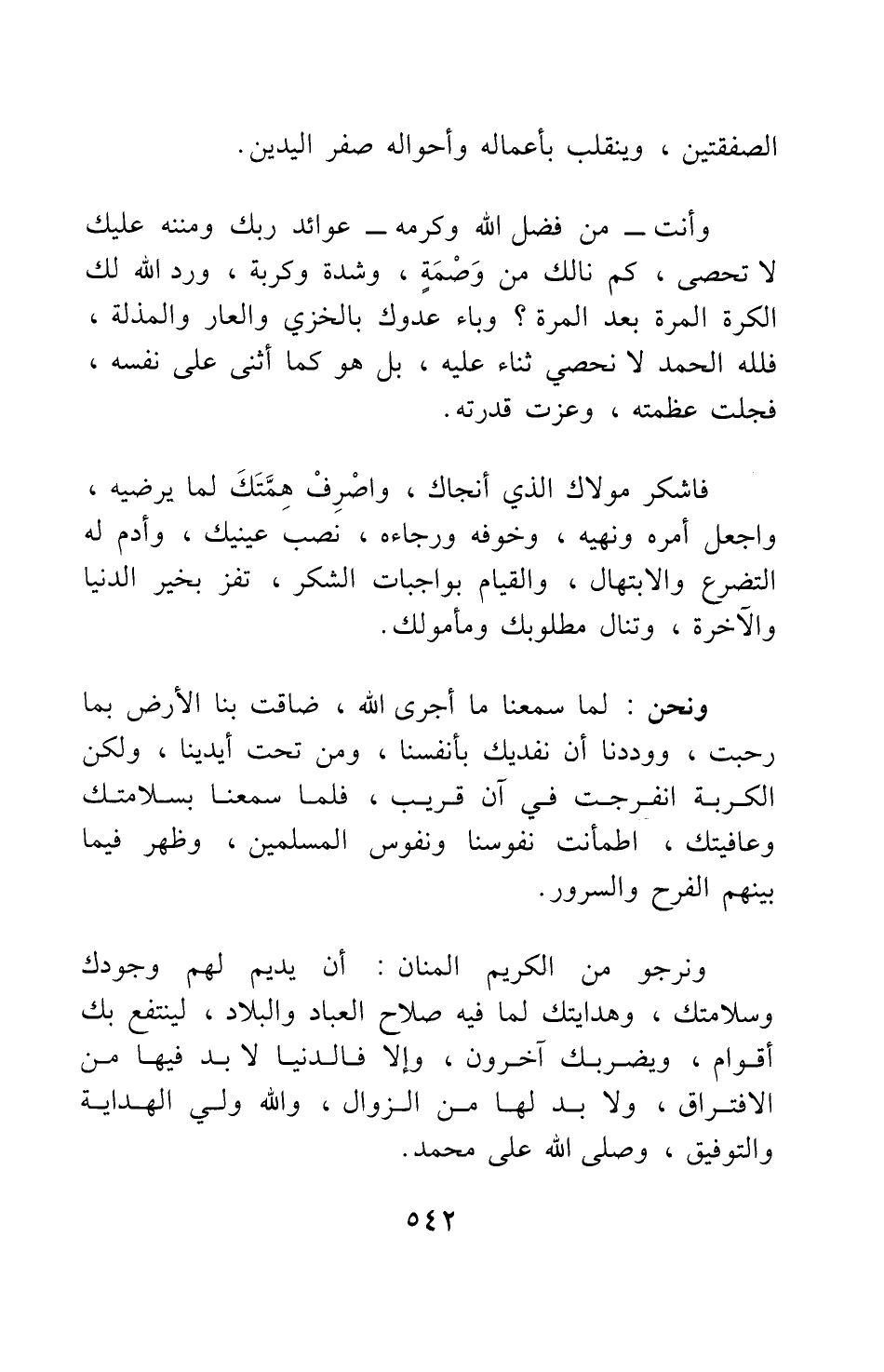 ونحن لما سمعنا ما أجرى الله، ضاقت بنا الأرض بما رحبت، ووددنا أن نفديك بأنفسنا، ومن تحت أيدينا، ولكن الكربة انفرجت في آن قريب، فلما سمعنا بسلامتك وعافيتك، اطمأنت نفوسنا ونفوس المسلمين، وظهر فيما بينهم الفرح والسرور.