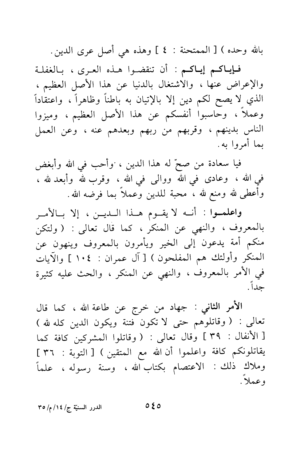 فإياكم إياكم أن تنقضوا هذه العرى، بالغفلة والإعراض عنها، والاشتغال بالدنيا عن هذا الأصل العظيم، الذي لا يصح لكم دين إلا بالإتيان به باطنا وظاهرا، واعتقادا وعملا؛ وحاسبوا أنفسكم عن هذا الأصل العظيم، وميزوا الناس بدينهم، وقربهم من ربهم وبعدهم عنه، وعن العمل بما أمروا به.
