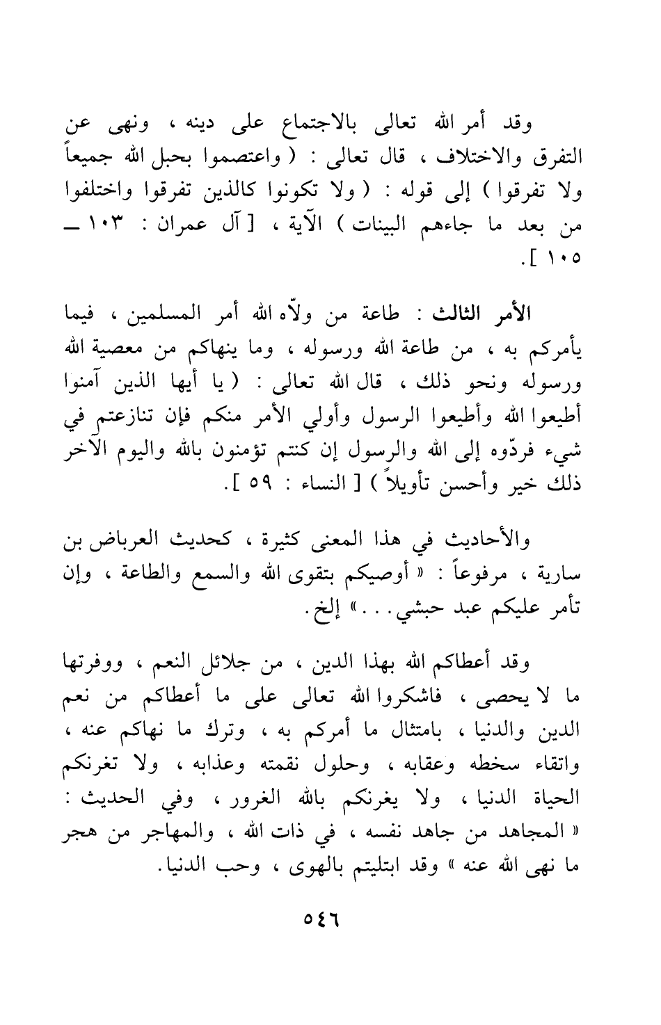 وقد أمر الله تعالى بالاجتماع على دينه، ونهى عن التفرق والاختلاف، قال تعالى: {وَاعْتَصِمُوا بِحَبْلِ اللَّهِ جَمِيعاً وَلا تَفَرَّقُوا} إلى قوله: {وَلا تَكُونُوا كَالَّذِينَ تَفَرَّقُوا وَاخْتَلَفُوا مِنْ بَعْدِ مَا جَاءَهُمُ الْبَيِّنَاتُ} الآية [سورة آل عمران آية: 103 - 105] .