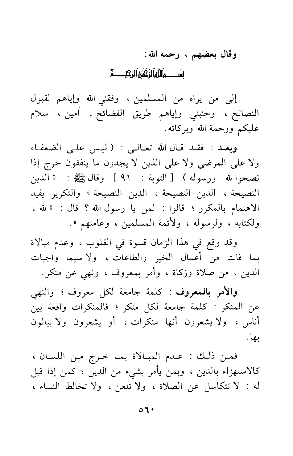 وبعد: فقد قال الله تعالى: {لَيْسَ عَلَى الضُّعَفَاءِ وَلا عَلَى الْمَرْضَى وَلا عَلَى الَّذِينَ لا يَجِدُونَ مَا يُنْفِقُونَ حَرَجٌ إِذَا نَصَحُوا لِلَّهِ وَرَسُولِهِ} [سورة التوبة آية: 91] . وقال صلى الله عليه وسلم: الدين النصيحة، الدين النصيحة، الدين النصيحة ـ والتكرير يفيد الاهتمام بالمكرر ـ; قالوا: لمن يا رسول الله؟ قال: لله، ولكتابه، ولرسوله، ولأئمة المسلمين، وعامتهم 1.