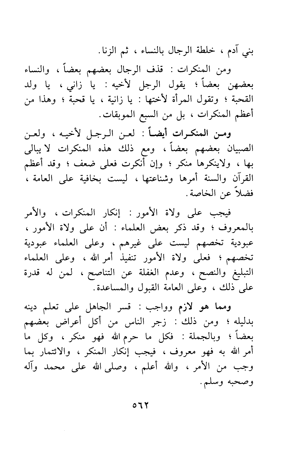 ومما هو لازم وواجب: قسر الجاهل على تعلم دينه بدليله; ومن ذلك: زجر الناس من أكل أعراض بعضهم بعضا; وبالجملة: فكل ما حرم الله فهو منكر، وكل ما أمر الله به فهو معروف، فيجب إنكار المنكر، والائتمار بما وجب من الأمر، والله أعلم، وصلى الله على محمد وآله وصحبه وسلم.