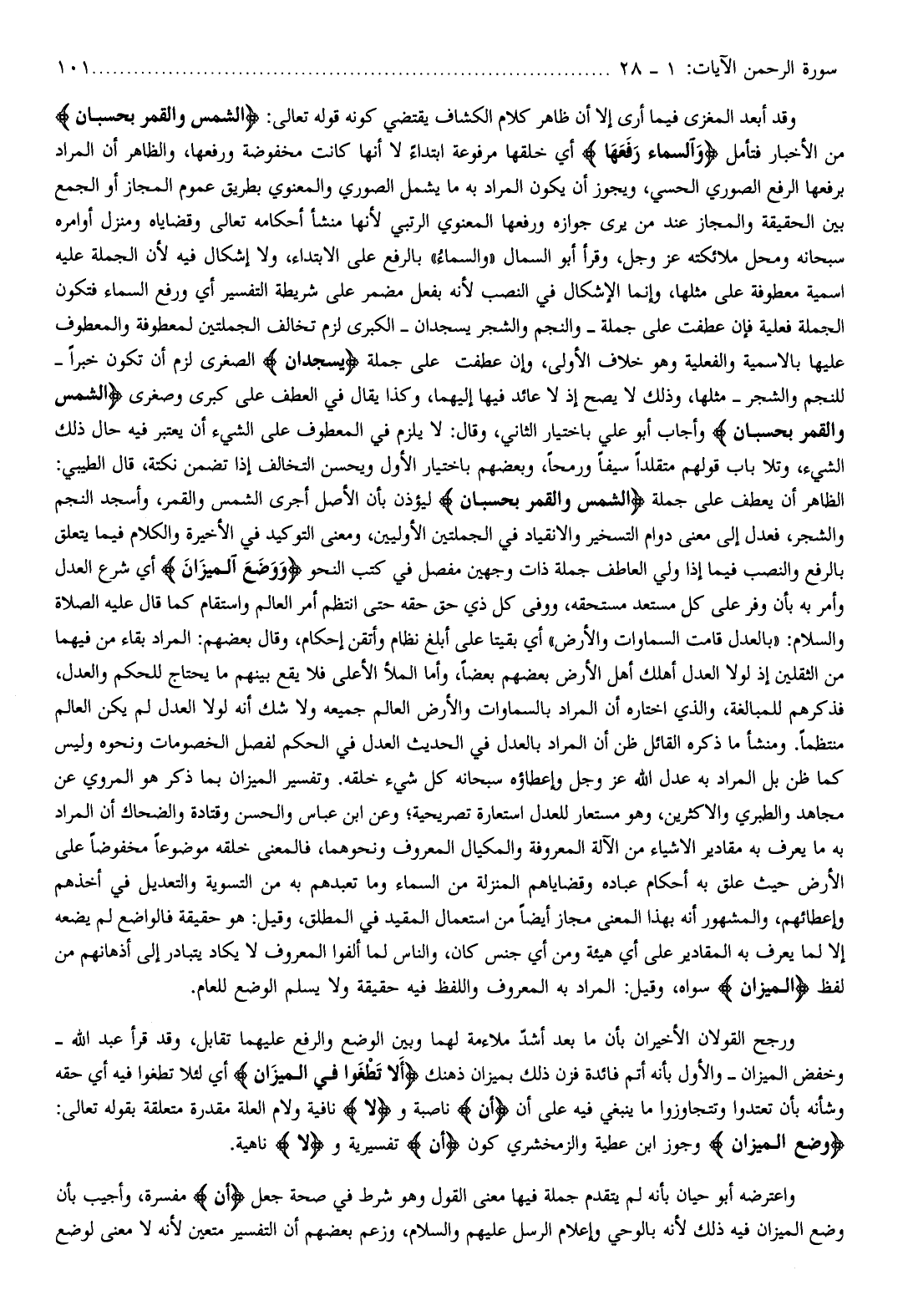 الظاهر أن يعطف على جملة الشَّمْسُ وَالْقَمَرُ بِحُسْبانٍ ليؤذن بأن الأصل أجرى الشمس والقمر، وأسجد النجم والشجر، فعدل إلى معنى دوام التسخير والانقياد في الجملتين الأوليين، ومعنى التوكيد في الأخيرة والكلام فيما يتعلق بالرفع والنصب فيما إذا ولي العاطف جملة ذات وجهين مفصل في كتب النحو وَوَضَعَ الْمِيزانَ أي شرع العدل وأمر به بأن وفر على كل مستعد مستحقه، ووفى كل ذي حق حقه حتى انتظم أمر العالم واستقام كما