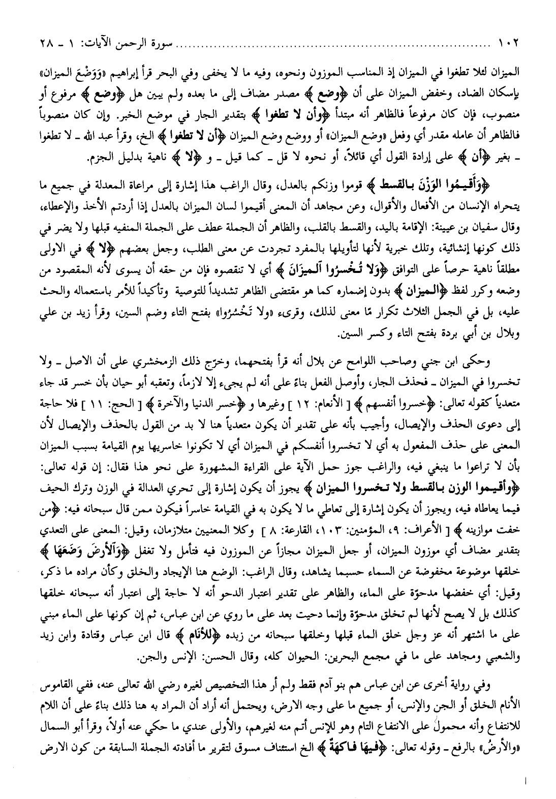 وَأَقِيمُوا الْوَزْنَ بِالْقِسْطِ وَلا تُخْسِرُوا الْمِيزانَ يجوز أن يكون إشارة إلى تحري العدالة في الوزن وترك الحيف فيما يعاطاه فيه، ويجوز أن يكون إشارة إلى تعاطي ما لا يكون به في القيامة خاسرا فيكون ممن قال سبحانه فيه: مَنْ خَفَّتْ مَوازِينُهُ [الأعراف: 9، المؤمنين: 103، القارعة: 8] وكلا المعنيين متلازمان، وقيل: المعنى على التعدي بتقدير مضاف أي موزون الميزان، أو جعل الميزان مجازا عن الموزون فيه فتأمل ولا تغفل وَالْأَرْضَ وَضَعَها خلقها موضوعة مخفوضة عن السماء حسبما يشاهد، وقال الراغب: الوضع هنا الإيجاد والخلق وكأن مراده ما ذكر، وقيل: أي خفضها مدحوّة على الماء، والظاهر على تقدير اعتبار الدحو أنه لا حاجة إلى اعتبار أنه سبحانه خلقها كذلك بل لا يصح لأنها لم تخلق مدحوّة وإنما دحيت بعد على ما روي عن ابن عباس، ثم إن كونها على الماء مبني على ما اشتهر أنه عز وجل خلق الماء قبلها وخلقها سبحانه من زبده لِلْأَنامِ قال ابن عباس وقتادة وابن زيد والشعبي ومجاهد على ما في مجمع البحرين: الحيوان كله، وقال الحسن: الإنس والجن.