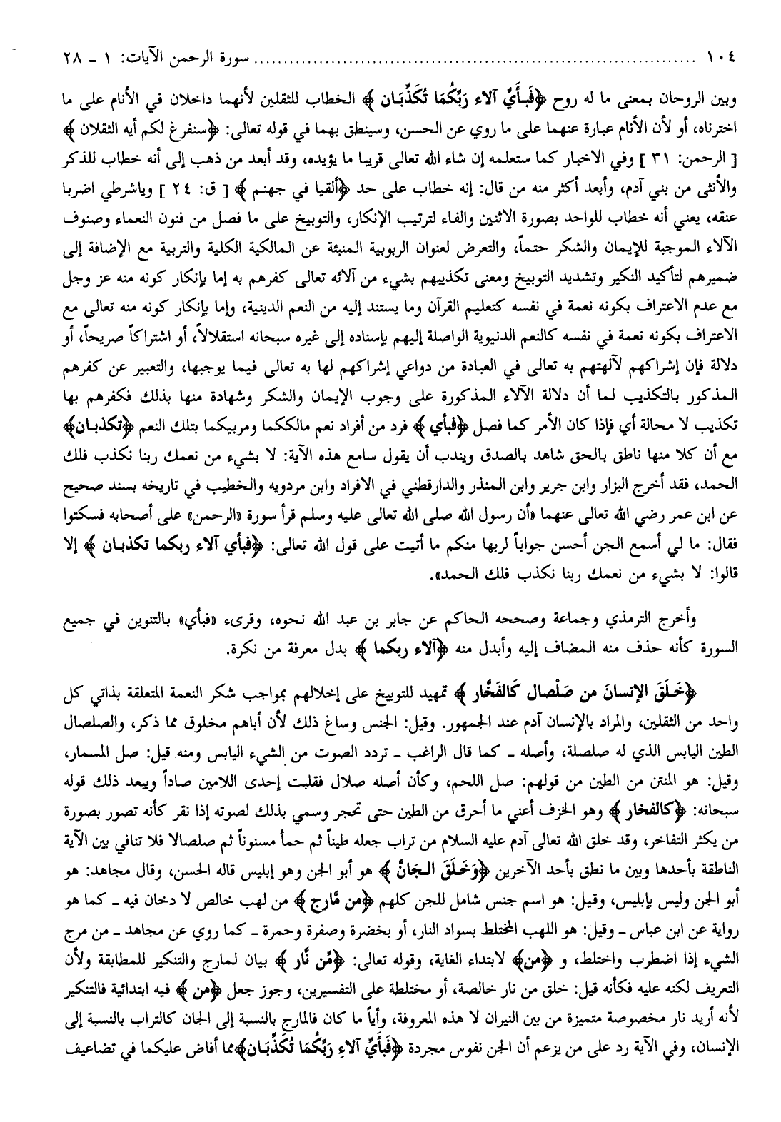 وبين الروحان بمعنى ما له روح فَبِأَيِّ آلاءِ رَبِّكُما تُكَذِّبانِ الخطاب للثقلين لأنهما داخلان في الأنام على ما اخترناه، أو لأن الأنام عبارة عنهما على ما روي عن الحسن، وسينطق بهما في قوله تعالى: سَنَفْرُغُ لَكُمْ أَيُّهَ الثَّقَلانِ [الرحمن: 31] وفي الاخبار كما ستعلمه إن شاء الله تعالى قريبا ما يؤيده، وقد أبعد من ذهب إلى أنه خطاب للذكر والأنثى من بني آدم، وأبعد أكثر منه من قال: إنه خطاب على حد أَلْقِيا فِي جَهَنَّمَ [ق: 24] ويا شرطي اضربا عنقه، يعني أنه خطاب للواحد بصورة الاثنين والفاء لترتيب الإنكار، والتوبيخ على ما فصل من فنون النعماء وصنوف الآلاء الموجبة للإيمان والشكر حتما، والتعرض لعنوان الربوبية المنبئة عن المالكية الكلية والتربية مع الإضافة إلى ضميرهم لتأكيد النكير وتشديد التوبيخ ومعنى تكذيبهم بشيء من آلائه تعالى كفرهم به إما بإنكار كونه منه عز وجل مع عدم الاعتراف بكونه نعمة في نفسه كتعليم القرآن وما يستند إليه من النعم الدينية، وإما بإنكار كونه منه تعالى مع الاعتراف بكونه نعمة في نفسه كالنعم الدنيوية الواصلة إليهم بإسناده إلى غيره سبحانه استقلالا، أو اشتراكا صريحا، أو دلالة فإن إشراكهم لآلهتهم به تعالى في العبادة من دواعي إشراكهم لها به تعالى فيما يوجبها، والتعبير عن كفرهم المذكور بالتكذيب لما أن دلالة الآلاء المذكورة على وجوب الإيمان والشكر وشهادة منها بذلك فكفرهم بها تكذيب لا محالة أي فإذا كان الأمر كما فصل فَبِأَيِّ فرد من أفراد نعم مالككما ومربيكما بتلك النعم تُكَذِّبانِ مع أن كلا منها ناطق بالحق شاهد بالصدق ويندب أن يقول سامع هذه الآية: لا بشيء من نعمك ربنا نكذب فلك الحمد،