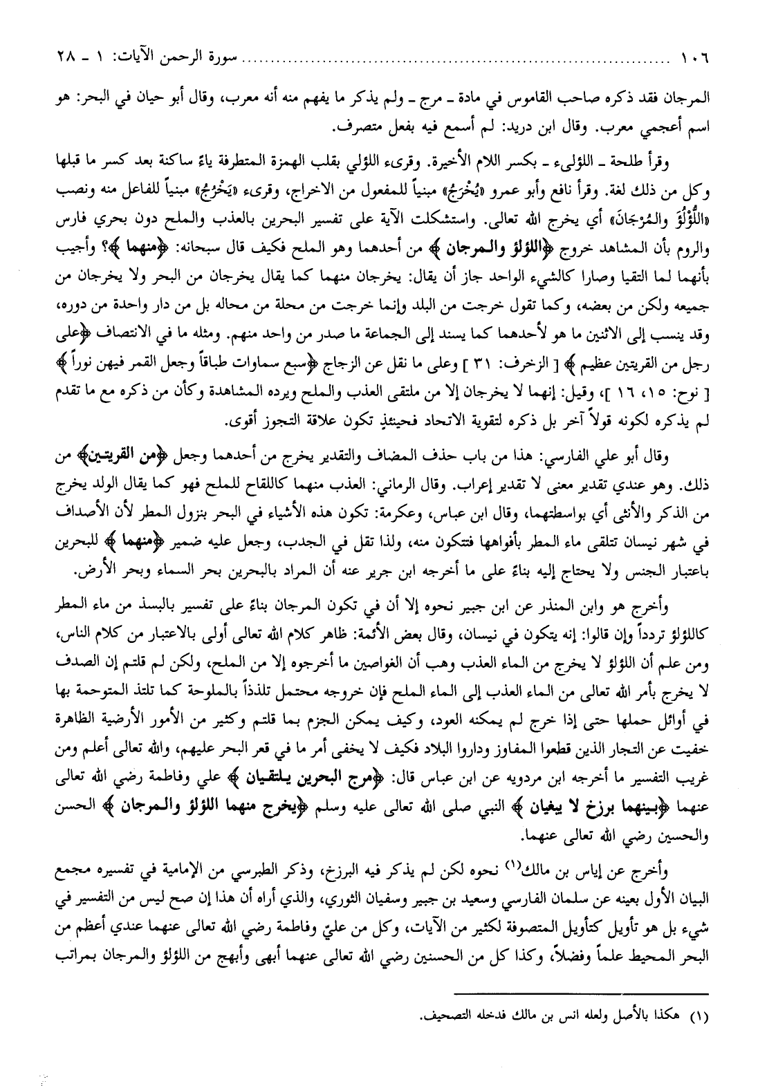 ، وذكر الطبرسي من الإمامية في تفسيره مجمع البيان الأول بعينه عن سلمان الفارسي وسعيد بن جبير وسفيان الثوري، والذي أراه أن هذا إن صح ليس من التفسير في شيء بل هو تأويل كتأويل المتصوفة لكثير من الآيات، وكل من عليّ وفاطمة رضي الله تعالى عنهما عندي أعظم من البحر المحيط علما وفضلا، وكذا كل من الحسنين رضي الله تعالى عنهما أبهى وأبهج من اللؤلؤ والمرجان بمراتب