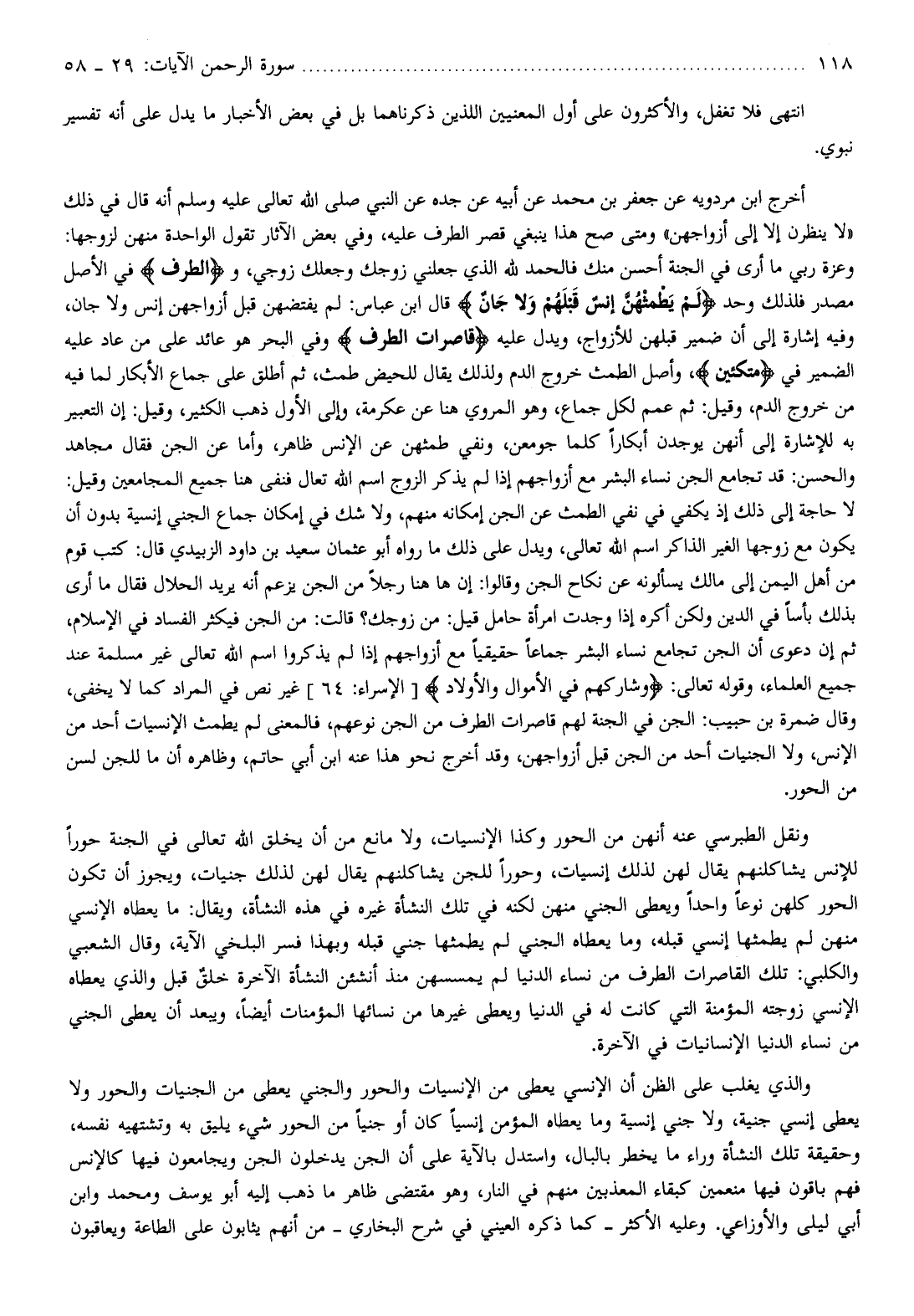 ونقل الطبرسي عنه أنهن من الحور وكذا الإنسيات، ولا مانع من أن يخلق الله تعالى في الجنة حورا للإنس يشاكلنهم يقال لهن لذلك إنسيات، وحورا للجن يشاكلنهم يقال لهن لذلك جنيات، ويجوز أن تكون الحور كلهن نوعا واحدا ويعطى الجني منهن لكنه في تلك النشأة غيره في هذه النشأة، ويقال: ما يعطاه الإنسي منهن لم يطمثها إنسي قبله، وما يعطاه الجني لم يطمثها جني قبله وبهذا فسر البلخي الآية، وقال الشعبي والكلبي: تلك القاصرات الطرف من نساء الدنيا لم يمسسهن منذ أنشئن النشأة الآخرة خلق قبل والذي يعطاه الإنسي زوجته المؤمنة التي كانت له في الدنيا ويعطى غيرها من نسائها المؤمنات أيضا، ويبعد أن يعطى الجني من نساء الدنيا الإنسانيات في الآخرة.