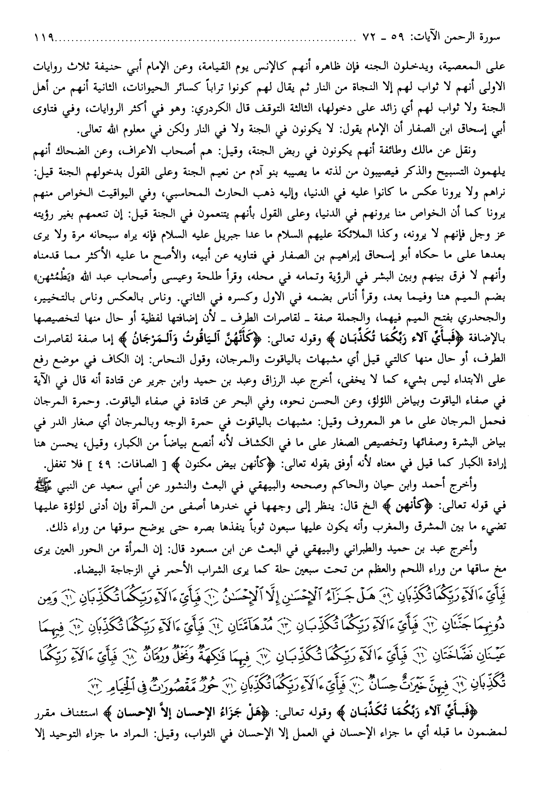 فَبِأَيِّ آلاءِ رَبِّكُما تُكَذِّبانِ وقوله تعالى: هَلْ جَزاءُ الْإِحْسانِ إِلَّا الْإِحْسانُ استئناف مقرر لمضمون ما قبله أي ما جزاء الإحسان في العمل إلا الإحسان في الثواب، وقيل: المراد ما جزاء التوحيد إلا