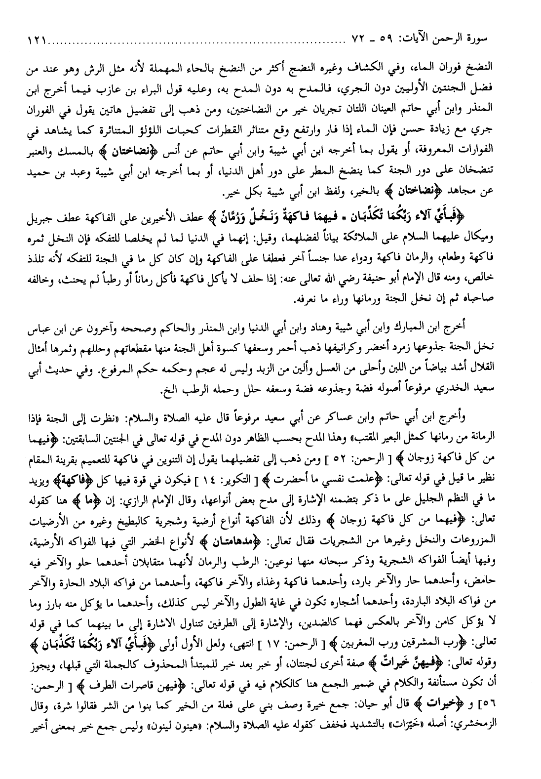 وهذا المدح بحسب الظاهر دون المدح في قوله تعالى في الجنتين السابقتين: فِيهِما مِنْ كُلِّ فاكِهَةٍ زَوْجانِ [الرحمن: 52] ومن ذهب إلى تفضيلهما يقول إن التنوين في فاكهة للتعميم بقرينة المقام نظير ما قيل في قوله تعالى: عَلِمَتْ نَفْسٌ ما أَحْضَرَتْ [التكوير: 14] فيكون في قوة فيها كل فاكِهَةٌ ويزيد ما في النظم الجليل على ما ذكر بتضمنه الإشارة إلى مدح بعض أنواعها، وقال الإمام الرازي: إن (ما) هنا كقوله تعالى: فِيهِما مِنْ كُلِّ فاكِهَةٍ زَوْجانِ وذلك لأن الفاكهة أنواع أرضية وشجرية كالبطيخ وغيره من الأرضيات المزروعات والنخل وغيرها من الشجريات فقال تعالى: مُدْهامَّتانِ لأنواع الخضر التي فيها الفواكه الأرضية، وفيها أيضا الفواكه الشجرية وذكر سبحانه منها نوعين: الرطب والرمان لأنهما متقابلان أحدهما حلو والآخر فيه حامض، وأحدهما حار والآخر بارد، وأحدهما فاكهة وغذاء والآخر فاكهة، وأحدهما من فواكه البلاد الحارة والآخر من فواكه البلاد الباردة، وأحدهما أشجاره تكون في غاية الطول والآخر ليس كذلك، وأحدهما ما يؤكل منه بارز وما لا يؤكل كامن والآخر بالعكس فهما كالضدين، والإشارة إلى الطرفين تتناول الاشارة إلى ما بينهما كما في قوله تعالى: رَبُّ الْمَشْرِقَيْنِ وَرَبُّ الْمَغْرِبَيْنِ [الرحمن: 17] انتهى، ولعل الأول أولى فَبِأَيِّ آلاءِ رَبِّكُما تُكَذِّبانِ وقوله تعالى: فِيهِنَّ خَيْراتٌ صفة أخرى لجنتان، أو خبر بعد خبر للمبتدأ المحذوف كالجملة التي قبلها، ويجوز أن تكون مستأنفة والكلام في ضمير الجمع هنا كالكلام فيه في قوله تعالى: فِيهِنَّ قاصِراتُ الطَّرْفِ [الرحمن: