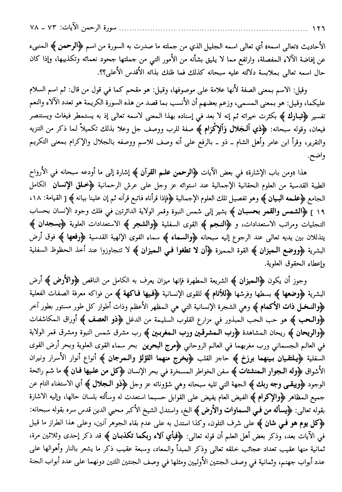 وجوز أن يكون الْمِيزانِ الشريعة المطهرة فإنها ميزان يعرف به الكامل من الناقص وَالْأَرْضَ أرض البشرية وَضَعَها بسطها وفرشها لِلْأَنامِ للقوى الإنسانية فِيها فاكِهَةٌ من فواكه معرفة الصفات الفعلية وَالنَّخْلُ ذاتُ الْأَكْمامِ وهي الشجرة الإنسانية التي هي المظهر الأعظم وذات أطوار كل طور مستور بطور آخر وَالْحَبُّ هو حب الحب المبذور في مزارع القلوب السليمة من الدغل ذُو الْعَصْفِ أوراق المكاشفات وَالرَّيْحانُ ريحان المشاهدة رَبُّ الْمَشْرِقَيْنِ وَرَبُّ الْمَغْرِبَيْنِ رب مشرق شمس النبوة ومشرق قمر الولاية في العالم الجسماني ورب مغربهما في العالم الروحاني مَرَجَ الْبَحْرَيْنِ بحر سماء القوى العلوية وبحر أرض القوى السفلية يَلْتَقِيانِ بَيْنَهُما بَرْزَخٌ حاجز القلب يَخْرُجُ مِنْهُمَا اللُّؤْلُؤُ وَالْمَرْجانُ أنواع أنوار الأسرار ونيران الأشواق وَلَهُ الْجَوارِ الْمُنْشَآتُ سفن الخواطر المسخرة في بحر الإنسان كُلُّ مَنْ عَلَيْها فانٍ ما شم رائحة الوجود وَيَبْقى وَجْهُ رَبِّكَ الجهة التي تليه سبحانه وهي شؤوناته عز وجل ذُو الْجَلالِ أي الاستغناء التام عن جميع المظاهر وَالْإِكْرامِ الفيض العام يفيض على القوابل حسبما استعدت له وسألته بلسان حالها، وإليه الاشارة بقوله تعالى: يَسْئَلُهُ مَنْ فِي السَّماواتِ وَالْأَرْضِ إلخ، واستدل الشيخ الأكبر محيي الدين قدس سره بقوله سبحانه: