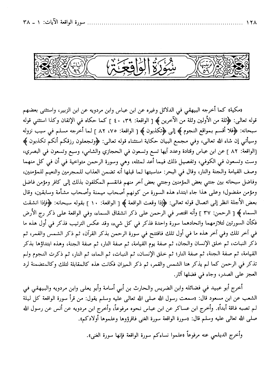 «مكية» كما أخرجه البيهقي في الدلائل وغيره عن ابن عباس وابن مردويه عن ابن الزبير، واستثنى بعضهم قوله تعالى: ثُلَّةٌ مِنَ الْأَوَّلِينَ وَثُلَّةٌ مِنَ الْآخِرِينَ [الواقعة: 39، 40] كما حكاه في الإتقان وكذا استثني قوله سبحانه: فَلا أُقْسِمُ بِمَواقِعِ النُّجُومِ إلى تُكَذِّبُونَ [الواقعة: 75، 82] لما أخرجه مسلم في سبب نزوله وسيأتي إن شاء الله تعالى، وفي مجمع البيان حكاية استثناء قوله تعالى: وَتَجْعَلُونَ رِزْقَكُمْ أَنَّكُمْ تُكَذِّبُونَ [الواقعة: 82] عن ابن عباس وقتادة وعدد آيها تسع وتسعون في الحجازي والشامي، وسبع وتسعون في البصري، وست وتسعون في الكوفي، وتفصيل ذلك فيما أعد لمثله، وهي وسورة الرحمن متواخية في أن في كل منهما وصف القيامة والجنة والنار، وقال في البحر: مناسبتها لما قبلها أنه تضمن العذاب للمجرمين والنعيم للمؤمنين، وفاضل سبحانه بين جنتي بعض المؤمنين وجنتي بعض آخر منهم فانقسم المكلفون بذلك إلى كافر ومؤمن فاضل ومؤمن مفضول وعلى هذا جاء ابتداء هذه السورة من كونهم أصحاب ميمنة وأصحاب مشأمة وسابقين، وقال بعض الأجلة انظر إلى اتصال قوله تعالى: إِذا وَقَعَتِ الْواقِعَةُ [الواقعة: 10] بقوله سبحانه: فَإِذَا انْشَقَّتِ السَّماءُ [الرحمن: 37] وأنه اقتصر في الرحمن على ذكر انشقاق السماء، وفي الواقعة على ذكر رج الأرض فكأن السورتين لتلازمهما واتحادهما سورة واحدة فذكر في كل شيء، وقد عكس الترتيب فذكر في أول هذه ما في آخر تلك وفي آخر هذه ما في أول تلك فافتتح في سورة الرحمن بذكر القرآن، ثم ذكر الشمس والقمر، ثم ذكر النبات، ثم خلق الإنسان والجان، ثم صفة يوم القيامة، ثم صفة النار، ثم صفة الجنة، وهذه ابتداؤها بذكر القيامة، ثم صفة الجنة، ثم صفة النار ثم خلق الإنسان، ثم النبات، ثم الماء، ثم النار، ثم ذكرت النجوم ولم تذكر في الرحمن كما لم يذكر هنا الشمس والقمر، ثم ذكر الميزان فكانت هذه كالمقابلة لتلك وكالمتضمنة لرد العجز على الصدر، وجاء في فضلها آثار.
