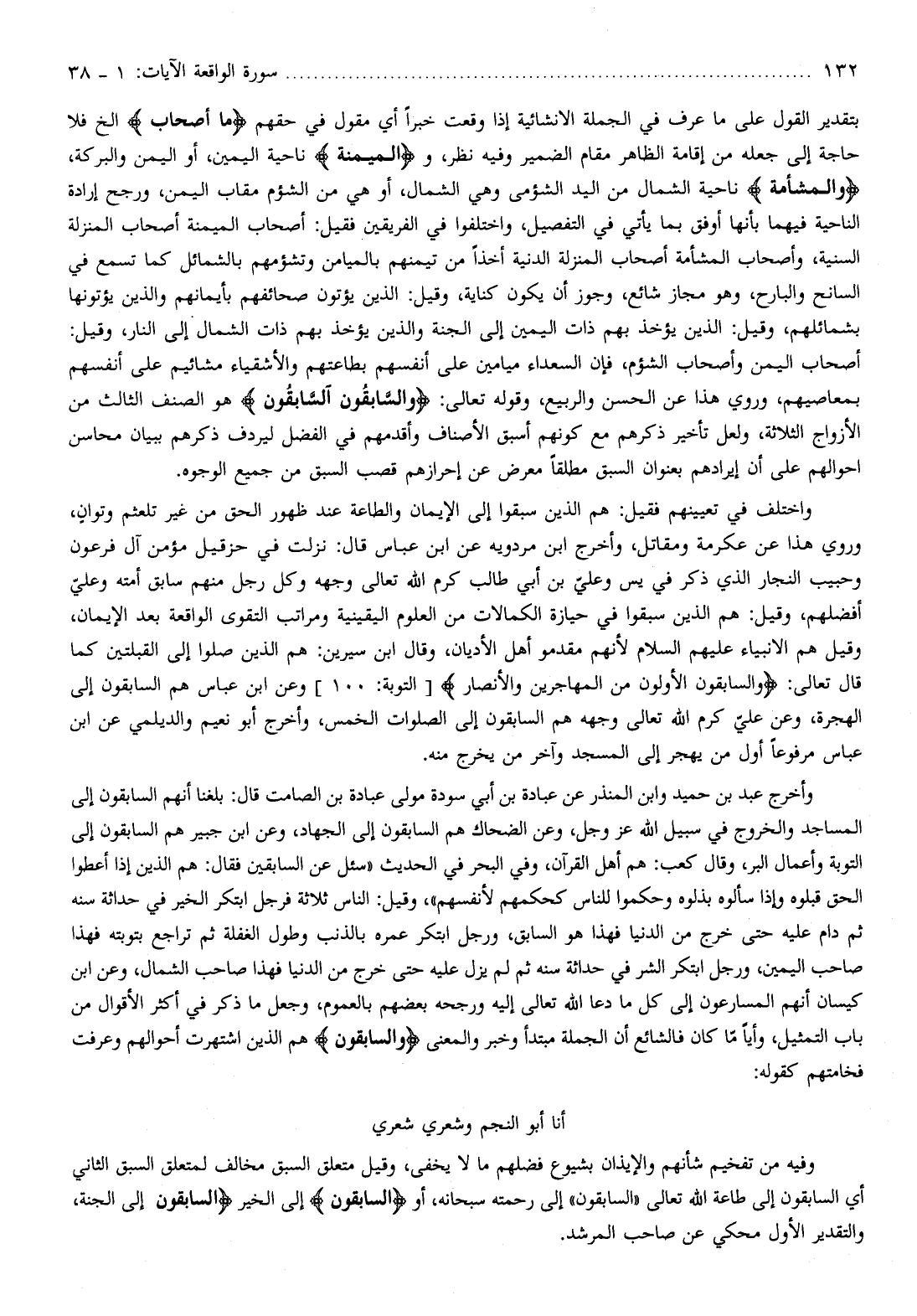 أنا أبو النجم وشعري شعري وفيه من تفخيم شأنهم والإيذان بشيوع فضلهم ما لا يخفى، وقيل متعلق السبق مخالف لمتعلق السبق الثاني أي السابقون إلى طاعة الله تعالى «السابقون» إلى رحمته سبحانه، أو السَّابِقُونَ إلى الخير السَّابِقُونَ إلى الجنة، والتقدير الأول محكي عن صاحب المرشد.