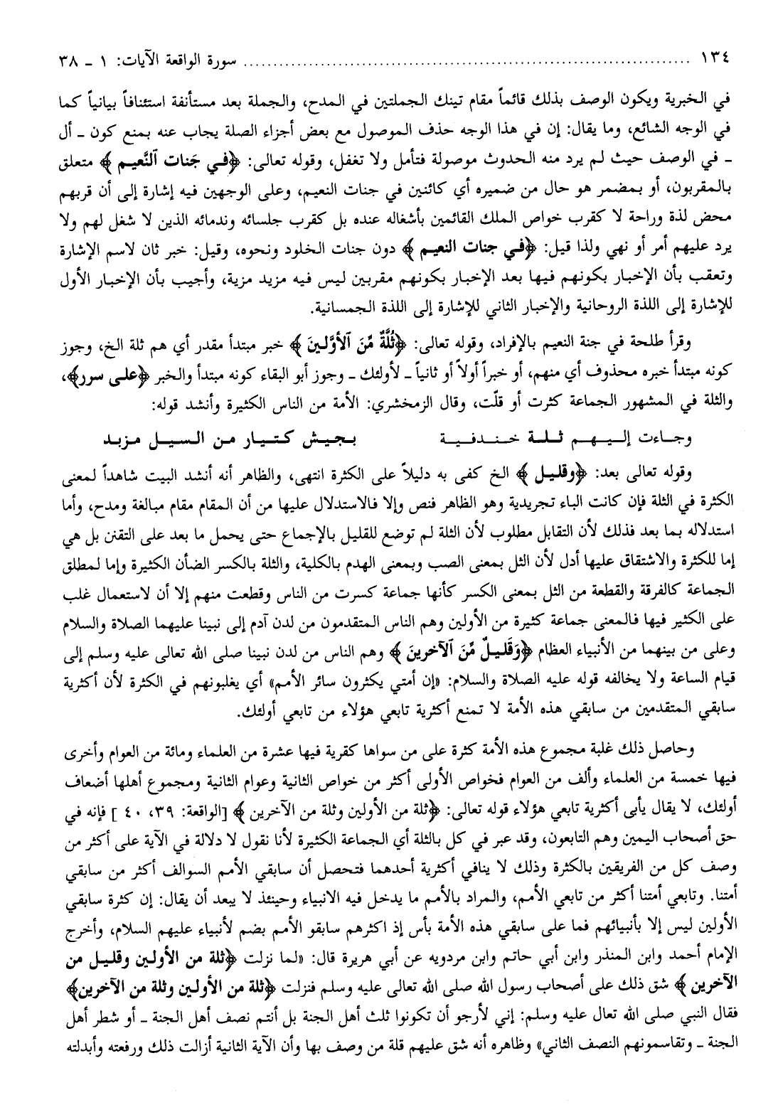 وقرأ طلحة في جنة النعيم بالإفراد، وقوله تعالى: ثُلَّةٌ مِنَ الْأَوَّلِينَ خبر مبتدأ مقدر أي هم ثلة إلخ، وجوز كونه مبتدأ خبره محذوف أي منهم، أو خبرا أولا أو ثانيا- لأولئك- وجوز أبو البقاء كونه مبتدأ والخبر عَلى سُرُرٍ، والثلة في المشهور الجماعة كثرت أو قلّت، وقال الزمخشري: الأمة من الناس الكثيرة وأنشد قوله: