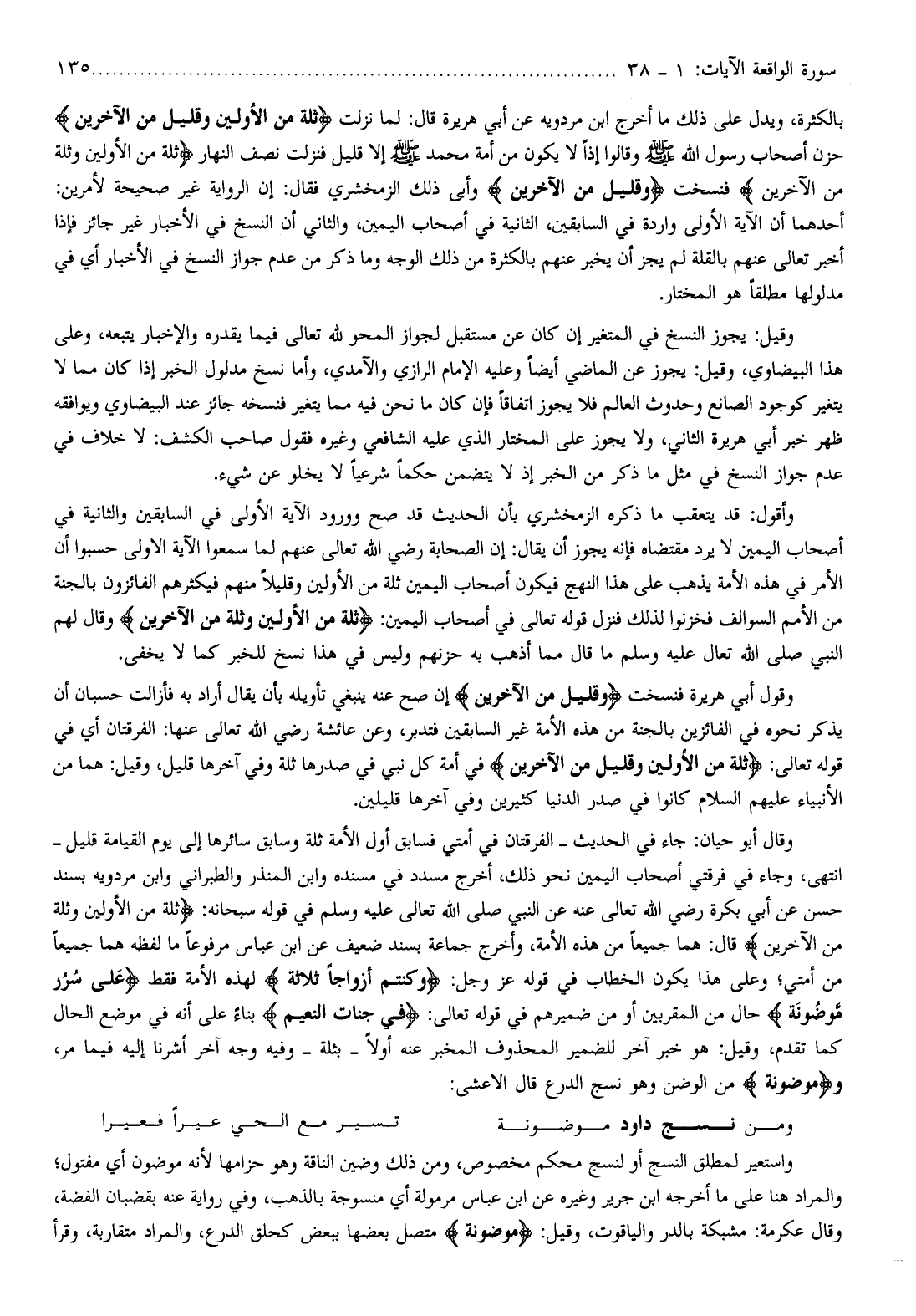 بالكثرة، ويدل على ذلك ما أخرج ابن مردويه عن أبي هريرة قال: لما نزلت ثُلَّةٌ مِنَ الْأَوَّلِينَ وَقَلِيلٌ مِنَ الْآخِرِينَ حزن أصحاب رسول الله صلّى الله عليه وسلم وقالوا إذا لا يكون من أمة محمد صلّى الله عليه وسلم إلا قليل فنزلت نصف النهار ثُلَّةٌ مِنَ الْأَوَّلِينَ وَثُلَّةٌ مِنَ الْآخِرِينَ فنسخت وَقَلِيلٌ مِنَ الْآخِرِينَ وأبى ذلك الزمخشري فقال: إن الرواية غير صحيحة لأمرين: