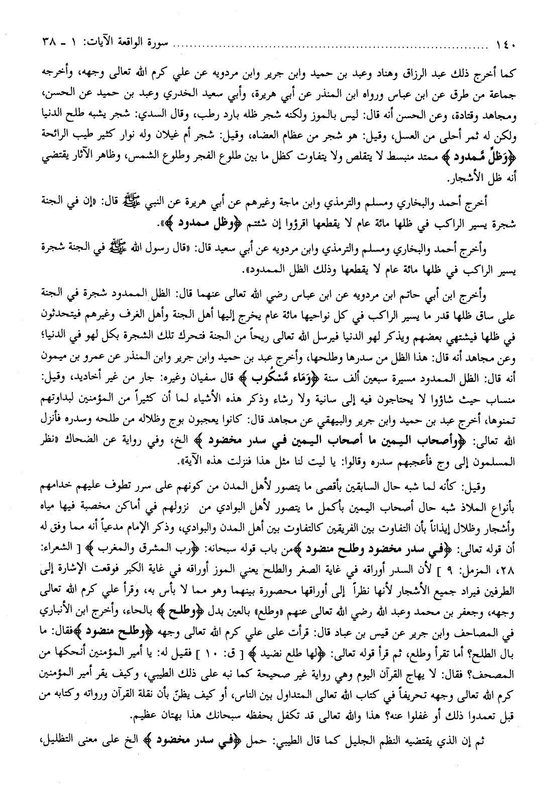 أخرج أحمد والبخاري ومسلم والترمذي وابن ماجة وغيرهم عن أبي هريرة عن النبي صلّى الله عليه وسلم قال: «إن في الجنة شجرة يسير الراكب في ظلها مائة عام لا يقطعها اقرؤوا إن شئتم وَظِلٍّ مَمْدُودٍ»