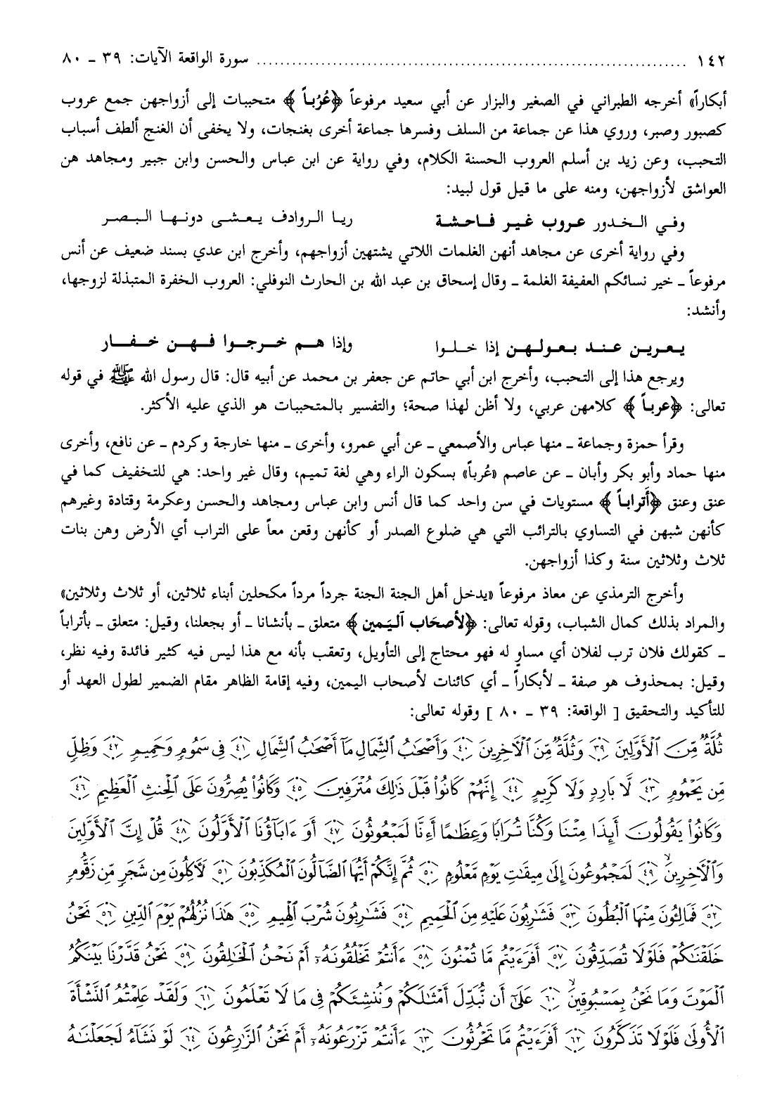 وفي رواية أخرى عن مجاهد أنهن الغلمات اللاتي يشتهين أزواجهم، وأخرج ابن عدي بسند ضعيف عن أنس مرفوعا- خير نسائكم العفيفة الغلمة- وقال إسحاق بن عبد الله بن الحارث النوفلي: العروب الخفرة المتبذلة لزوجها، وأنشد: