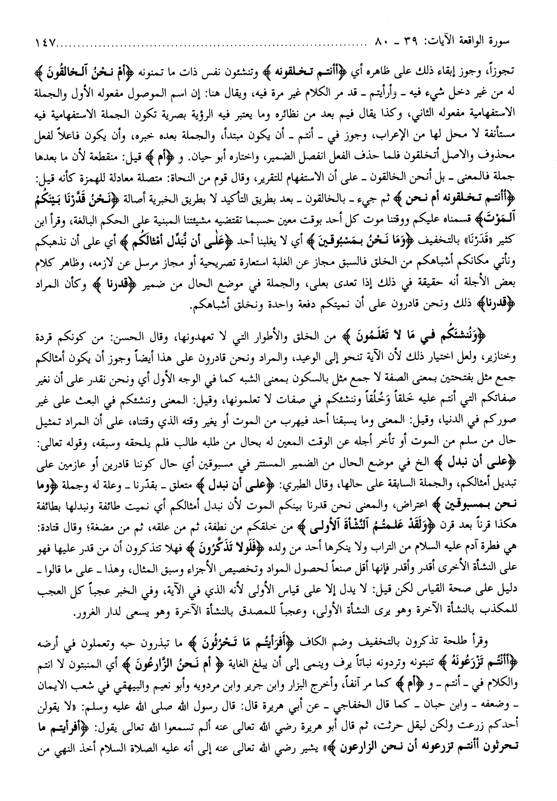 أَأَنْتُمْ تَخْلُقُونَهُ أَمْ نَحْنُ ثم جيء- بالخالقون- بعد بطريق التأكيد لا بطريق الخبرية أصالة نَحْنُ قَدَّرْنا بَيْنَكُمُ الْمَوْتَ قسمناه عليكم ووقتنا موت كل أحد بوقت معين حسبما تقتضيه مشيئتنا المبنية على الحكم البالغة، وقرأ ابن كثير «قدرنا» بالتخفيف وَما نَحْنُ بِمَسْبُوقِينَ أي لا يغلبنا أحد عَلى أَنْ نُبَدِّلَ أَمْثالَكُمْ