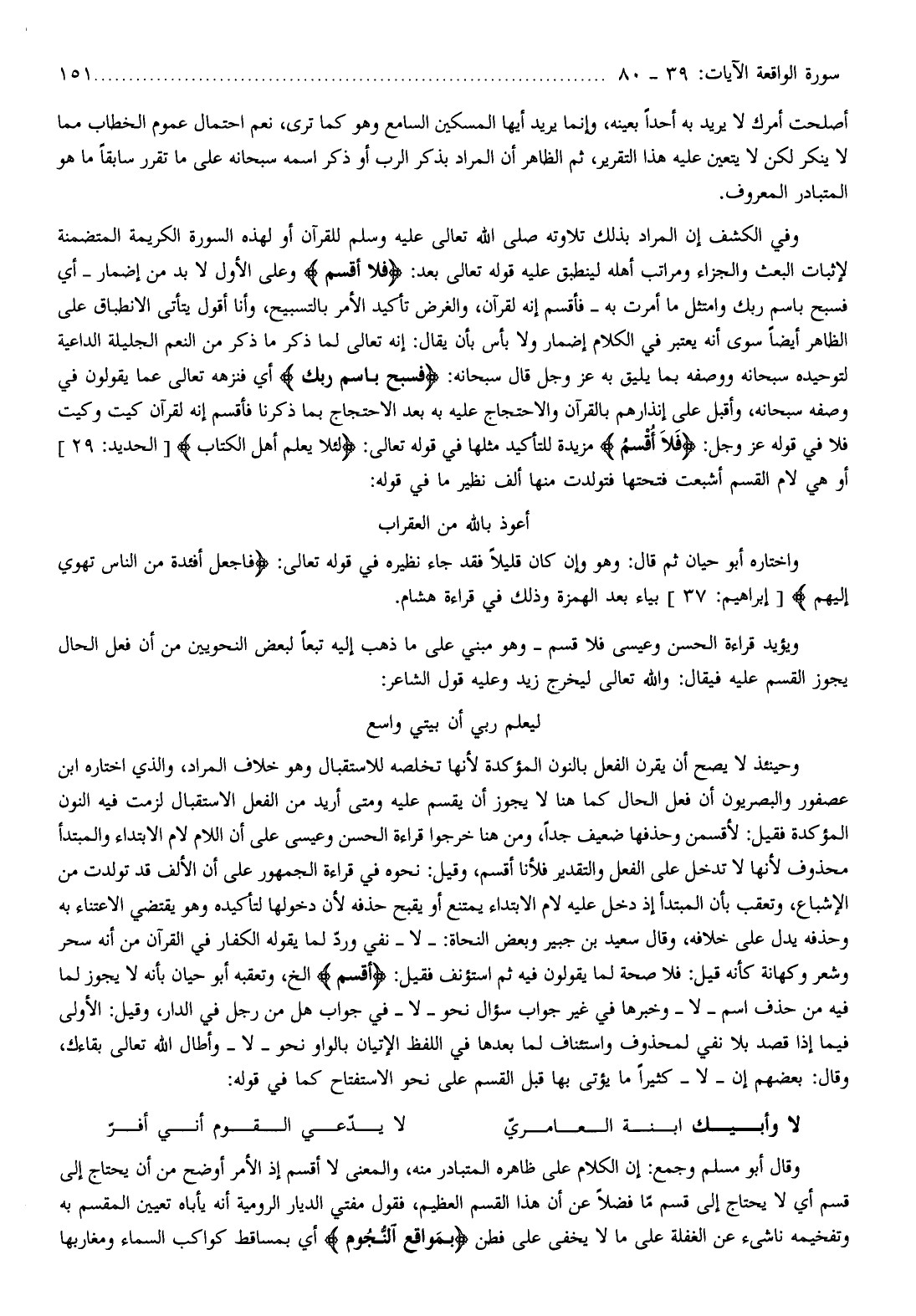 ليعلم ربي أن بيتي واسع وحينئذ لا يصح أن يقرن الفعل بالنون المؤكدة لأنها تخلصه للاستقبال وهو خلاف المراد، والذي اختاره ابن عصفور والبصريون أن فعل الحال كما هنا لا يجوز أن يقسم عليه ومتى أريد من الفعل الاستقبال لزمت فيه النون المؤكدة فقيل: لأقسمن وحذفها ضعيف جدا، ومن هنا خرجوا قراءة الحسن وعيسى على أن اللام لام الابتداء والمبتدأ محذوف لأنها لا تدخل على الفعل والتقدير فلأنا أقسم، وقيل: نحوه في قراءة الجمهور على أن الألف قد تولدت من الإشباع، وتعقب بأن المبتدأ إذ دخل عليه لام الابتداء يمتنع أو يقبح حذفه لأن دخولها لتأكيده وهو يقتضي الاعتناء به وحذفه يدل على خلافه، وقال سعيد بن جبير وبعض النحاة:- لا- نفي وردّ لما يقوله الكفار في القرآن من أنه سحر وشعر وكهانة كأنه قيل: فلا صحة لما يقولون فيه ثم استؤنف فقيل: أُقْسِمُ إلخ، وتعقبه أبو حيان بأنه لا يجوز لما فيه من حذف اسم- لا- وخبرها في غير جواب سؤال نحو- لا- في جواب هل من رجل في الدار، وقيل: الأولى فيما إذا قصد بلا نفي لمحذوف واستئناف لما بعدها في اللفظ الإتيان بالواو نحو- لا- وأطال الله تعالى بقاءك، وقال: بعضهم إن- لا- كثيرا ما يؤتى بها قبل القسم على نحو الاستفتاح كما في قوله: