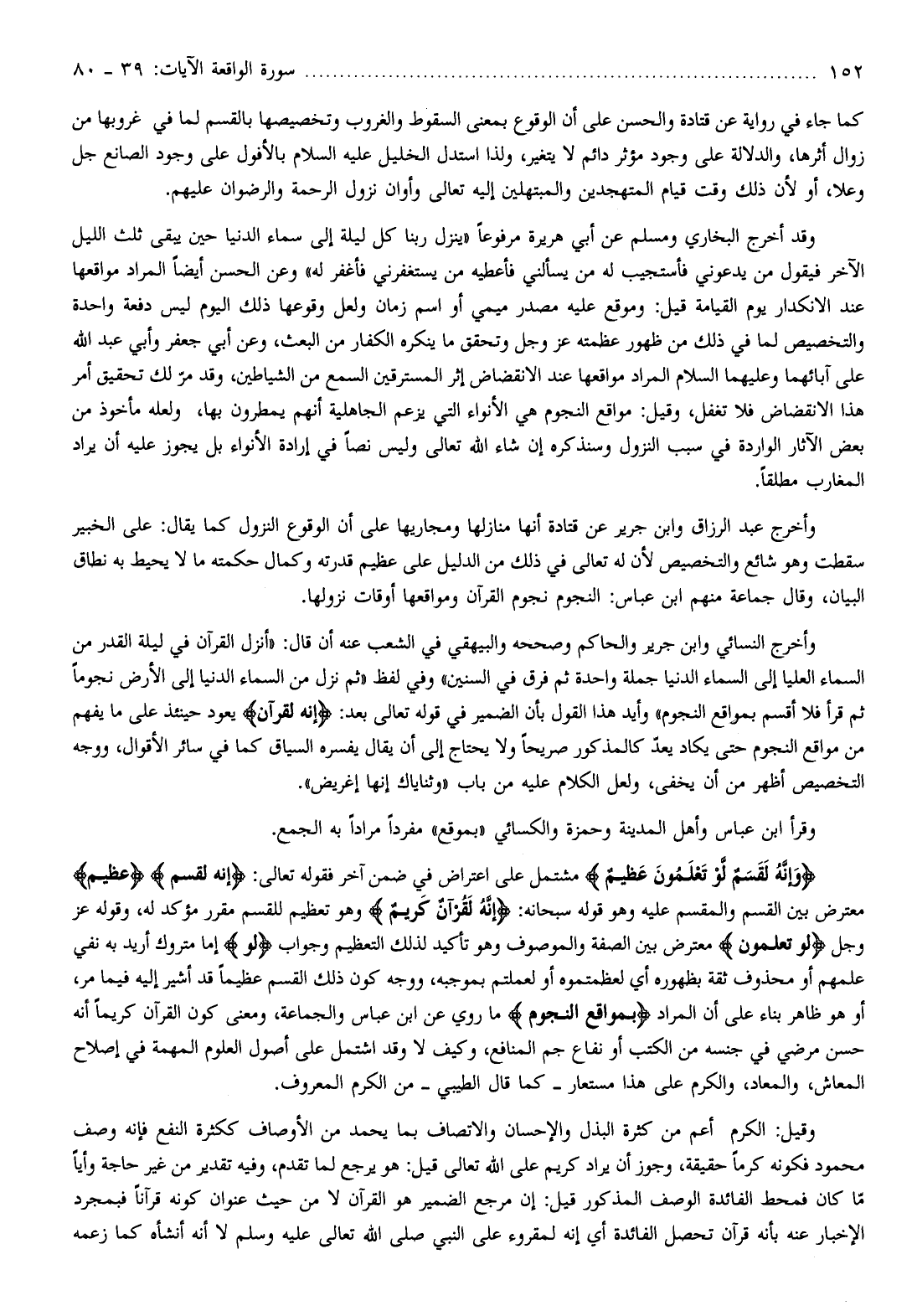 وأيد هذا القول بأن الضمير في قوله تعالى بعد: إِنَّهُ لَقُرْآنٌ يعود حينئذ على ما يفهم من مواقع النجوم حتى يكاد يعدّ كالمذكور صريحا ولا يحتاج إلى أن يقال يفسره السياق كما في سائر الأقوال، ووجه التخصيص أظهر من أن يخفى، ولعل الكلام عليه من باب «وثناياك إنها إغريض» .