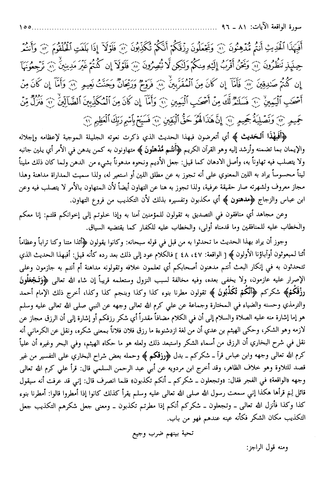 وقد أخرج ابن مردويه عن أبي عبد الرحمن السلمي قال: قرأ علي كرم الله تعالى وجهه «الواقعة» في الفجر فقال: «وتجعلون- شكركم- أنكم تكذبون» فلما انصرف قال: إني قد عرفت أنه سيقول قائل لم قرأها هكذا إني سمعت رسول الله صلى الله تعالى عليه وسلم يقرأ كذلك كانوا إذا أمطروا قالوا: أمطرنا بنوء كذا وكذا فأنزل الله تعالى- وتجعلون- شكركم أنكم إذا مطرتم تكذبون-