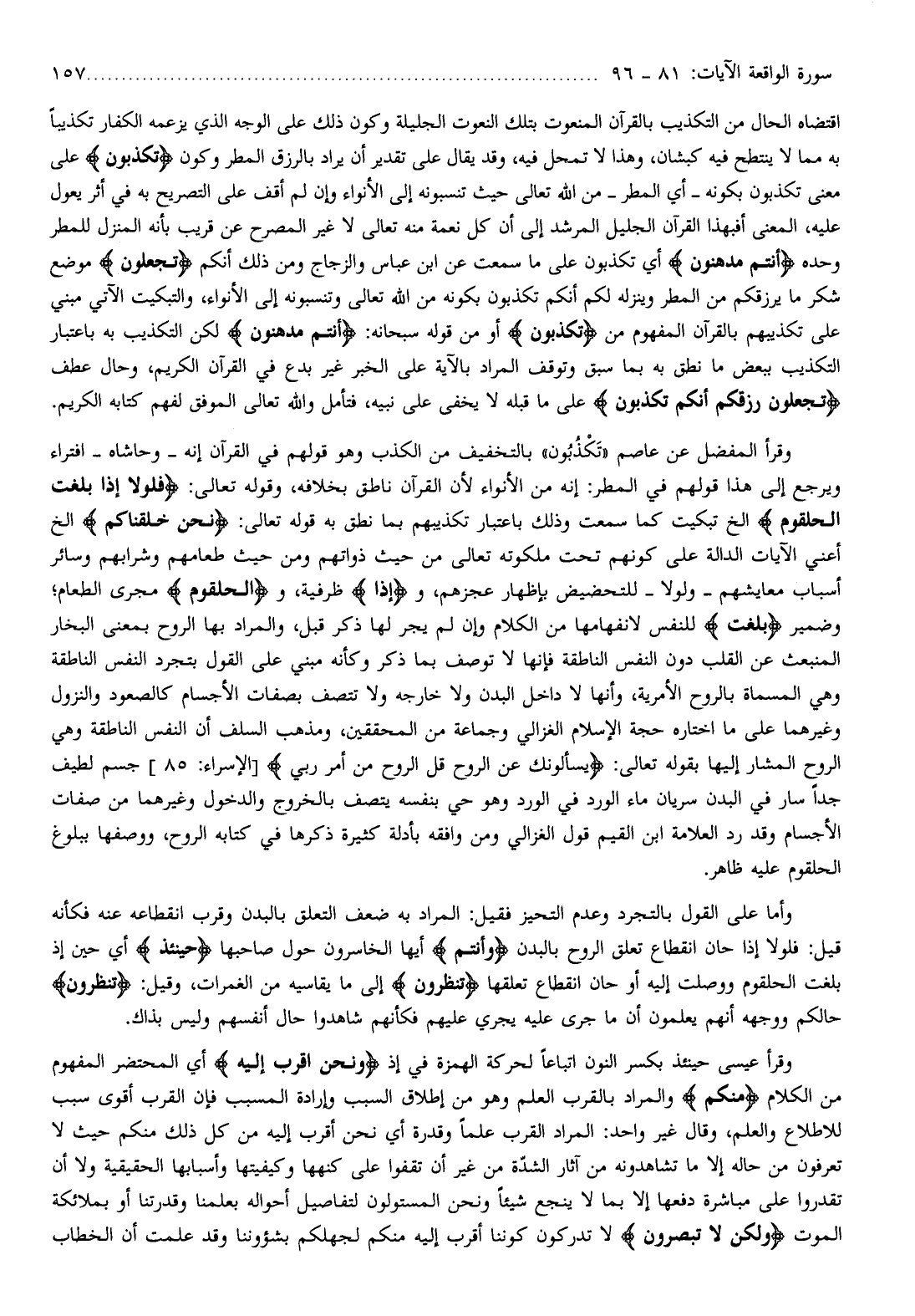 وقرأ المفضل عن عاصم «تكذبون» بالتخفيف من الكذب وهو قولهم في القرآن إنه- وحاشاه- افتراء ويرجع إلى هذا قولهم في المطر: إنه من الأنواء لأن القرآن ناطق بخلافه، وقوله تعالى: فَلَوْلا إِذا بَلَغَتِ الْحُلْقُومَ إلخ تبكيت كما سمعت وذلك باعتبار تكذيبهم بما نطق به قوله تعالى: نَحْنُ خَلَقْناكُمْ إلخ أعني الآيات الدالة على كونهم تحت ملكوته تعالى من حيث ذواتهم ومن حيث طعامهم وشرابهم وسائر أسباب معايشهم- ولولا- للتحضيض بإظهار عجزهم، وإِذا ظرفية، والْحُلْقُومَ مجرى الطعام وضمير بَلَغَتِ للنفس لانفهامها من الكلام وإن لم يجر لها ذكر قبل، والمراد بها الروح بمعنى البخار المنبعث عن القلب دون النفس الناطقة فإنها لا توصف بما ذكر وكأنه مبني على القول بتجرد النفس الناطقة وهي المسماة بالروح الأمرية، وأنها لا داخل البدن ولا خارجه ولا تتصف بصفات الأجسام كالصعود والنزول وغيرهما على ما اختاره حجة الإسلام الغزالي وجماعة من المحققين، ومذهب السلف أن النفس الناطقة وهي الروح المشار إليها بقوله تعالى: يَسْئَلُونَكَ عَنِ الرُّوحِ قُلِ الرُّوحُ مِنْ أَمْرِ رَبِّي [الإسراء: 85] جسم لطيف جدا سار في البدن سريان ماء الورد في الورد وهو حي بنفسه يتصف بالخروج والدخول وغيرهما من صفات الأجسام وقد رد العلامة ابن القيم قول الغزالي ومن وافقه بأدلة كثيرة ذكرها في كتابه الروح، ووصفها ببلوغ الحلقوم عليه ظاهر.