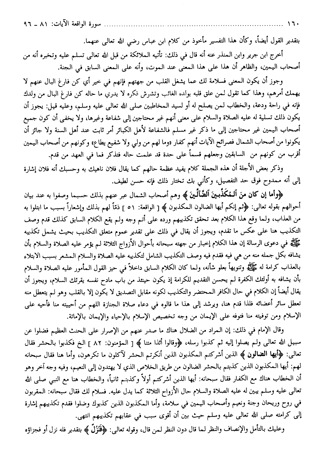 وقال الإمام في ذلك: إن المراد من الضلال هناك ما صدر عنهم من الإصرار على الحنث العظيم فضلوا عن سبيل الله تعالى ولم يصلوا إليه ثم كذبوا رسله، وقالُوا أَإِذا مِتْنا [المؤمنون: 82] إلخ فكذبوا بالحشر فقال تعالى: أَيُّهَا الضَّالُّونَ الذين أشركتم المكذبون الذين أنكرتم الحشر لآكلون ما تكرهون، وأما هنا فقال سبحانه لهم: أيها المكذبون الذين كذبتم بالحشر الضالون من طريق الخلاص الذي لا يهتدون إلى النعيم، وفيه وجه آخر وهو أن الخطاب هناك مع الكفار فقال سبحانه: أيها الذين أشركتم أولا وكذبتم ثانيا، والخطاب هنا مع النبي صلى الله تعالى عليه وسلم يبين له عليه الصلاة والسلام حال الأرواح الثلاثة كما يدل عليه. فسلام لك فقال سبحانه: المقربون في روح وريحان وجنة ونعيم وأصحاب اليمين في سلامة، وأما المكذبون الذين كذبوك وضلوا فقدم تكذيبهم إشارة إلى كرامته صلى الله تعالى عليه وسلم حيث بين أن أقوى سبب في عقابهم تكذيبهم انتهى.