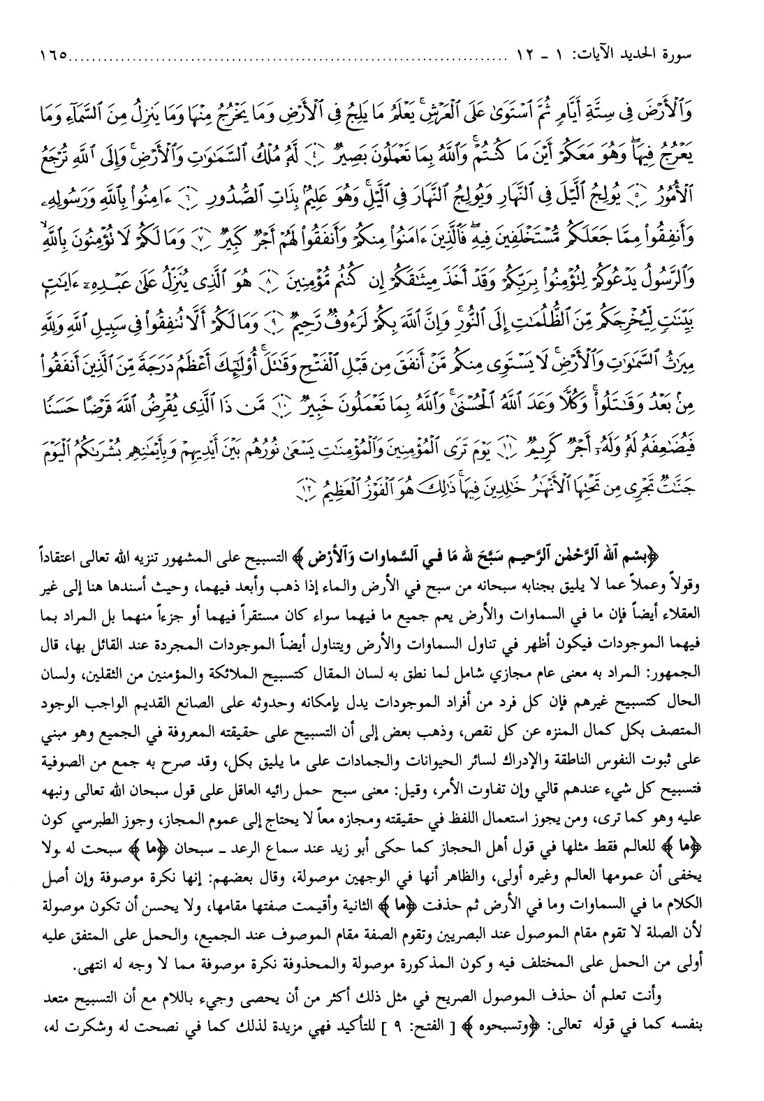 بِسْمِ اللَّهِ الرَّحْمنِ الرَّحِيمِ سَبَّحَ لِلَّهِ ما فِي السَّماواتِ وَالْأَرْضِ التسبيح على المشهور تنزيه الله تعالى اعتقادا وقولا وعملا عما لا يليق بجنابه سبحانه من سبح في الأرض والماء إذا ذهب وأبعد فيهما، وحيث أسندها هنا إلى غير العقلاء أيضا فإن ما في السماوات والأرض يعم جميع ما فيهما سواء كان مستقرا فيهما أو جزءا منهما بل المراد بما فيهما الموجودات فيكون أظهر في تناول السماوات والأرض ويتناول أيضا الموجودات المجردة عند القائل بها، قال الجمهور: المراد به معنى عام مجازي شامل لما نطق به لسان المقال كتسبيح الملائكة والمؤمنين من الثقلين، ولسان الحال كتسبيح غيرهم فإن كل فرد من أفراد الموجودات يدل بإمكانه وحدوثه على الصانع القديم الواجب الوجود المتصف بكل كمال المنزه عن كل نقص، وذهب بعض إلى أن التسبيح على حقيقته المعروفة في الجميع وهو مبني على ثبوت النفوس الناطقة والإدراك لسائر الحيوانات والجمادات على ما يليق بكل، وقد صرح به جمع من الصوفية فتسبيح كل شيء عندهم قالي وإن تفاوت الأمر، وقيل: معنى سبح حمل رائيه العاقل على قول سبحان الله تعالى ونبهه عليه وهو كما ترى، ومن يجوز استعمال اللفظ في حقيقته ومجازه معا لا يحتاج إلى عموم المجاز، وجوز الطبرسي كون ما للعالم فقط مثلها في قول أهل الحجاز كما حكى أبو زيد عند سماع الرعد- سبحان ما سبحت له ولا يخفى أن عمومها العالم وغيره أولى، والظاهر أنها في الوجهين موصولة، وقال بعضهم: إنها نكرة موصوفة وإن أصل الكلام ما في السماوات وما في الأرض ثم حذفت ما الثانية وأقيمت صفتها مقامها، ولا يحسن أن تكون موصولة لأن الصلة لا تقوم مقام الموصول عند البصريين وتقوم الصفة مقام الموصوف عند الجميع، والحمل على المتفق عليه أولى من الحمل على المختلف فيه وكون المذكورة موصولة والمحذوفة نكرة موصوفة مما لا وجه له انتهى.