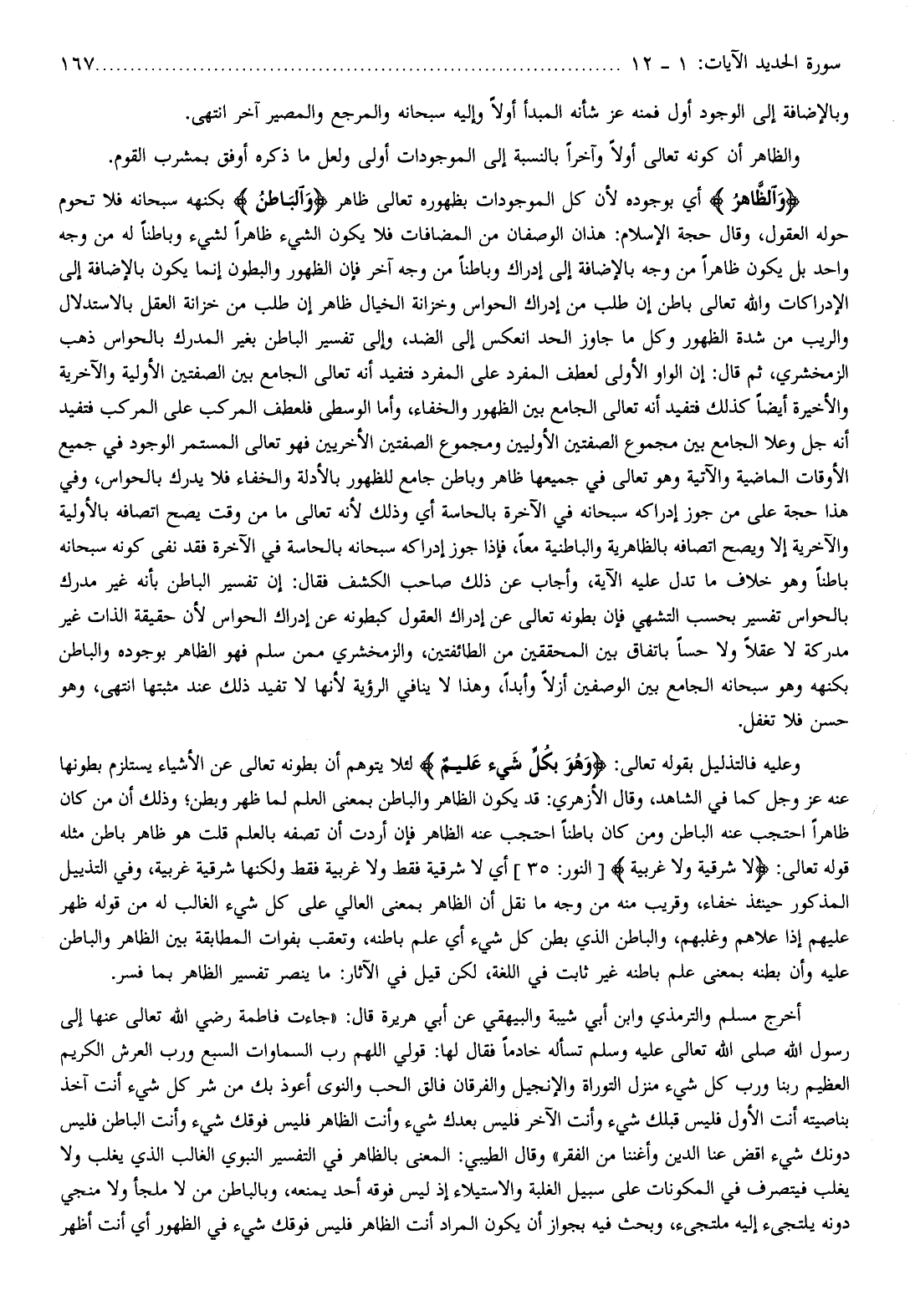 وعليه فالتذليل بقوله تعالى: وَهُوَ بِكُلِّ شَيْءٍ عَلِيمٌ لئلا يتوهم أن بطونه تعالى عن الأشياء يستلزم بطونها عنه عز وجل كما في الشاهد، وقال الأزهري: قد يكون الظاهر والباطن بمعنى العلم لما ظهر وبطن وذلك أن من كان ظاهرا احتجب عنه الباطن ومن كان باطنا احتجب عنه الظاهر فإن أردت أن تصفه بالعلم قلت هو ظاهر باطن مثله قوله تعالى: لا شَرْقِيَّةٍ وَلا غَرْبِيَّةٍ [النور: 35] أي لا شرقية فقط ولا غربية فقط ولكنها شرقية غربية، وفي التذييل المذكور حينئذ خفاء، وقريب منه من وجه ما نقل أن الظاهر بمعنى العالي على كل شيء الغالب له من قوله ظهر عليهم إذا علاهم وغلبهم، والباطن الذي بطن كل شيء أي علم باطنه، وتعقب بفوات المطابقة بين الظاهر والباطن عليه وأن بطنه بمعنى علم باطنه غير ثابت في اللغة، لكن قيل في الآثار: ما ينصر تفسير الظاهر بما فسر.