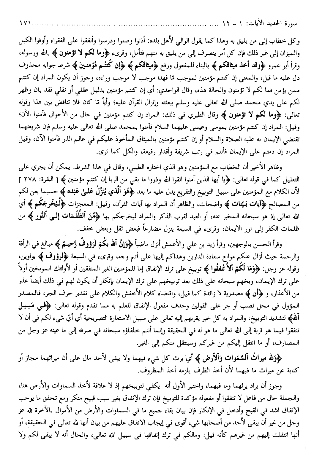 وظاهر الأخير أن الخطاب مع المؤمنين وهو الذي اختاره الطيبي، وقال في هذا الشرط: يمكن أن يجري على التعليل كما في قوله تعالى: يا أَيُّهَا الَّذِينَ آمَنُوا اتَّقُوا اللَّهَ وَذَرُوا ما بَقِيَ مِنَ الرِّبا إِنْ كُنْتُمْ مُؤْمِنِينَ [البقرة: 278] لأن الكلام مع المؤمنين على سبيل التوبيخ والتقريع يدل عليه ما بعد هُوَ الَّذِي يُنَزِّلُ عَلى عَبْدِهِ حسبما يعن لكم من المصالح آياتٍ بَيِّناتٍ واضحات، والظاهر أن المراد بها آيات القرآن، وقيل: المعجزات لِيُخْرِجَكُمْ أي الله تعالى إذ هو سبحانه المخبر عنه، أو العبد لقرب الذكر والمراد ليخرجكم بها مِنَ الظُّلُماتِ إِلَى النُّورِ من ظلمات الكفر إلى نور الايمان، وقرىء في السبعة ينزل مضارعا فبعض ثقل وبعض خفف.