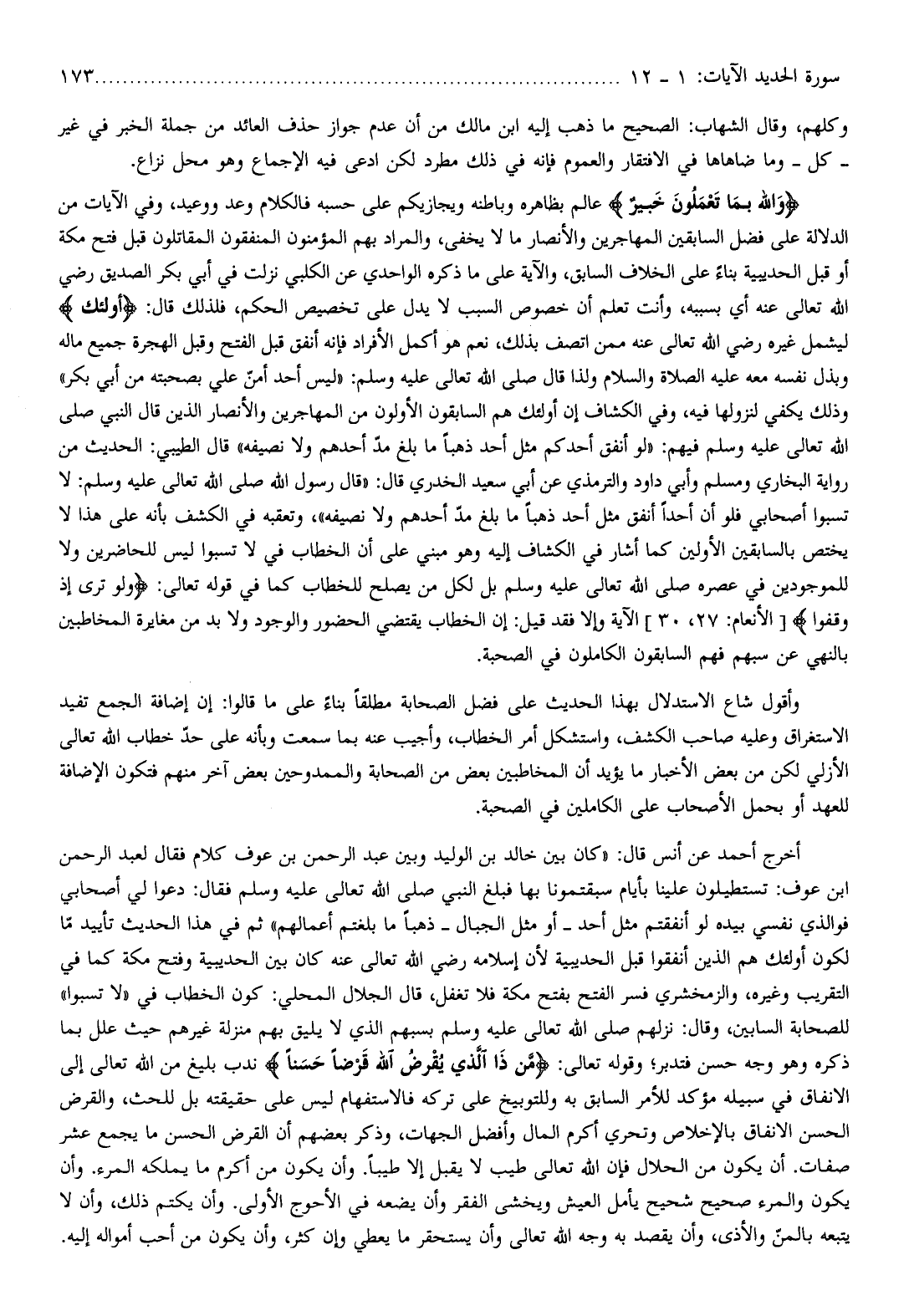 ثم في هذا الحديث تأييد ما لكون أولئك هم الذين أنفقوا قبل الحديبية لأن إسلامه رضي الله تعالى عنه كان بين الحديبية وفتح مكة كما في التقريب وغيره، والزمخشري فسر الفتح بفتح مكة فلا تغفل، قال الجلال المحلي: كون الخطاب في «لا تسبوا» للصحابة السابين، وقال: نزلهم صلى الله تعالى عليه وسلم بسبهم الذي لا يليق بهم منزلة غيرهم حيث علل بما ذكره وهو وجه حسن فتدبر وقوله تعالى: مَنْ ذَا الَّذِي يُقْرِضُ اللَّهَ قَرْضاً حَسَناً ندب بليغ من الله تعالى إلى الانفاق في سبيله مؤكد للأمر السابق به وللتوبيخ على تركه فالاستفهام ليس على حقيقته بل للحث، والقرض الحسن الانفاق بالإخلاص وتحري أكرم المال وأفضل الجهات، وذكر بعضهم أن القرض الحسن ما يجمع عشر صفات. أن يكون من الحلال فإن الله تعالى طيب لا يقبل إلا طيبا. وأن يكون من أكرم ما يملكه المرء. وأن يكون والمرء صحيح شحيح يأمل العيش ويخشى الفقر وأن يضعه في الأحوج الأولى. وأن يكتم ذلك، وأن لا يتبعه بالمنّ والأذى، وأن يقصد به وجه الله تعالى وأن يستحقر ما يعطي وإن كثر، وأن يكون من أحب أمواله إليه.